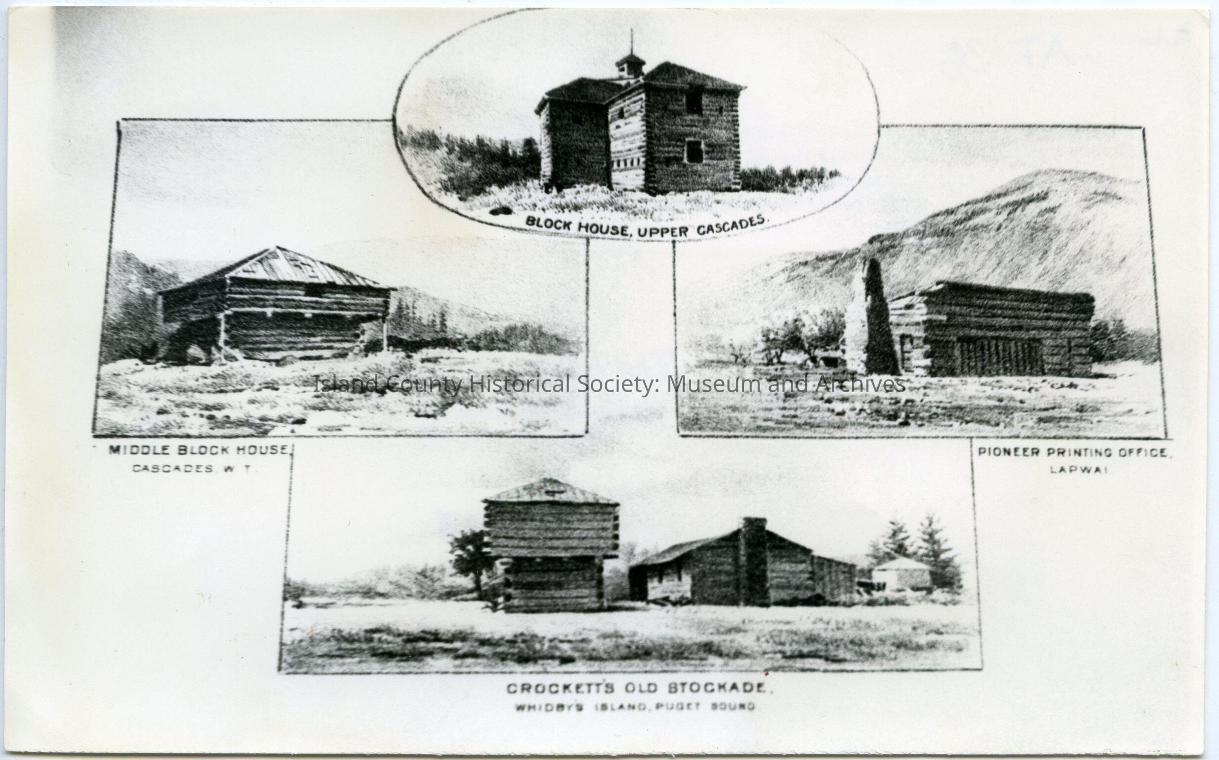 Copy of: Site #17 Crockett blockhouse -- the log house of Walter Crockett, Sr. is shown with the two blockhouses at each corner. Only the one fort remains. From Rev. Hines' history of 1893. There are four images of blockhouses. Crockett Blockhouse is on the bottom of the photo. There are two blockhouses with the house in between.