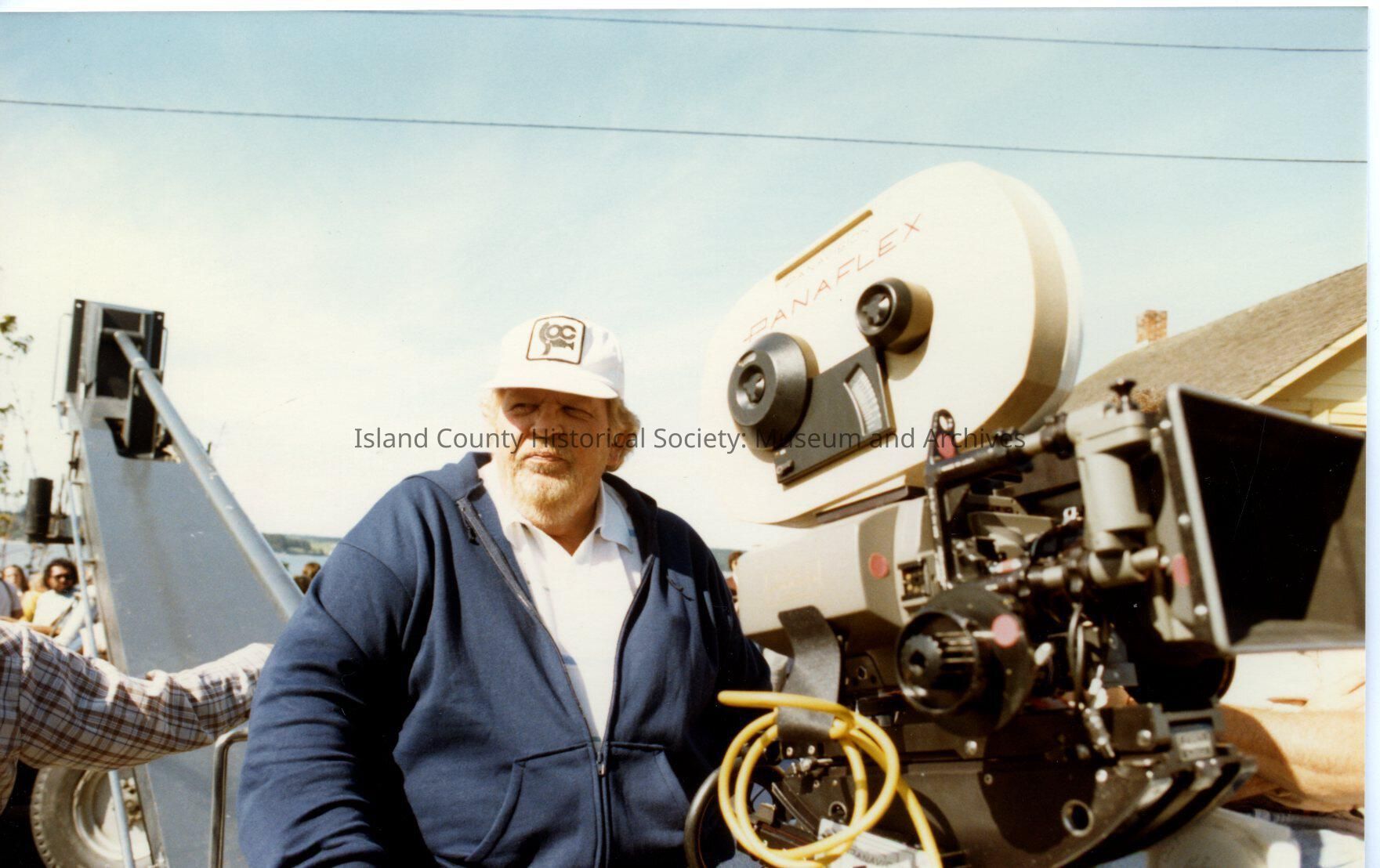Color photograph of film equipment and crew on Front Street. Man sits on boom with camera. Filming of Cry for the Stranger in Coupeville, 1982.