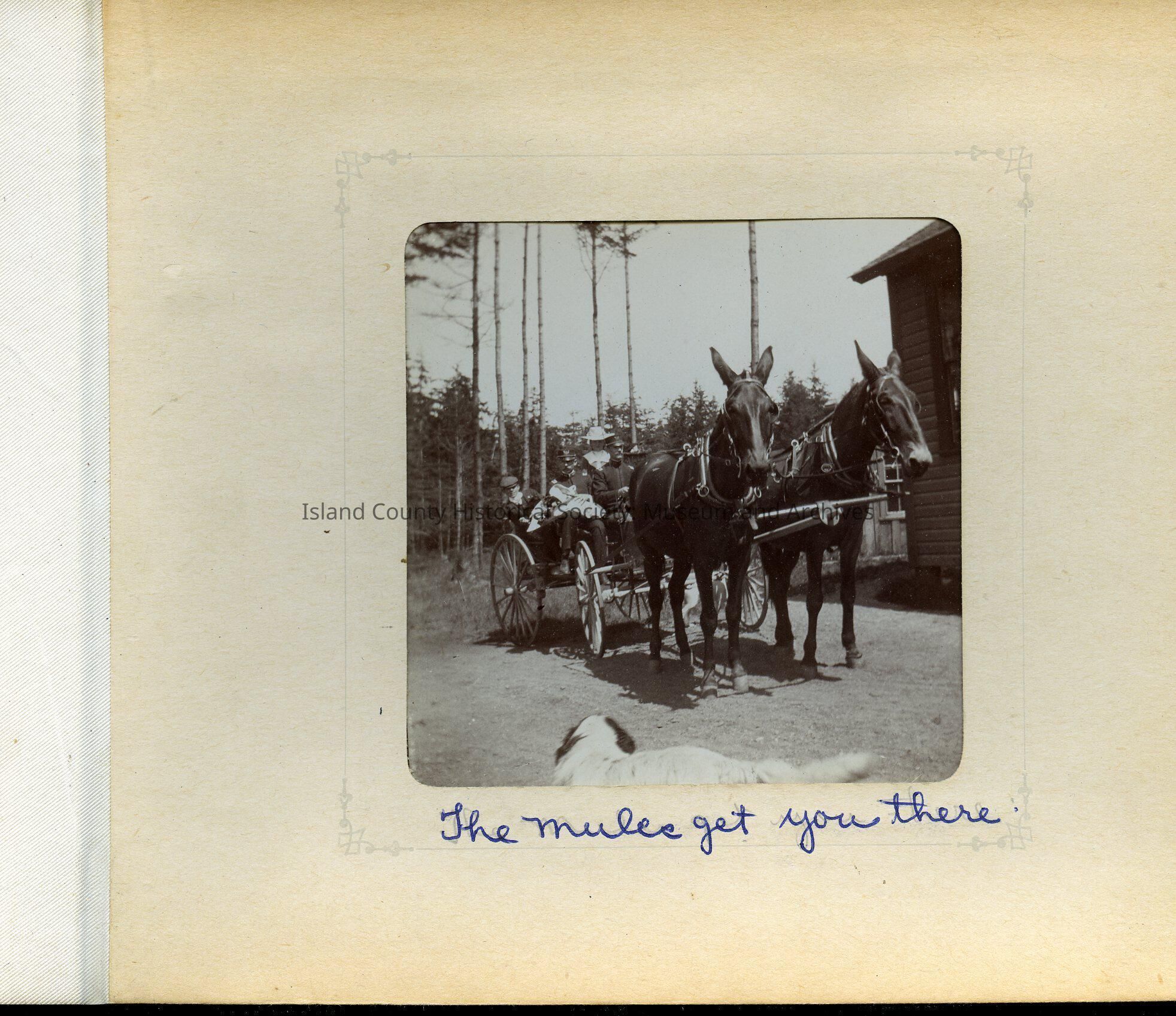 A buggy from the front with a dog in the foreground. Two mules pull the wagon. Two uniformed men are in front and one drives. A boy, girl and woman are behind. Note reads: The mules get you there.