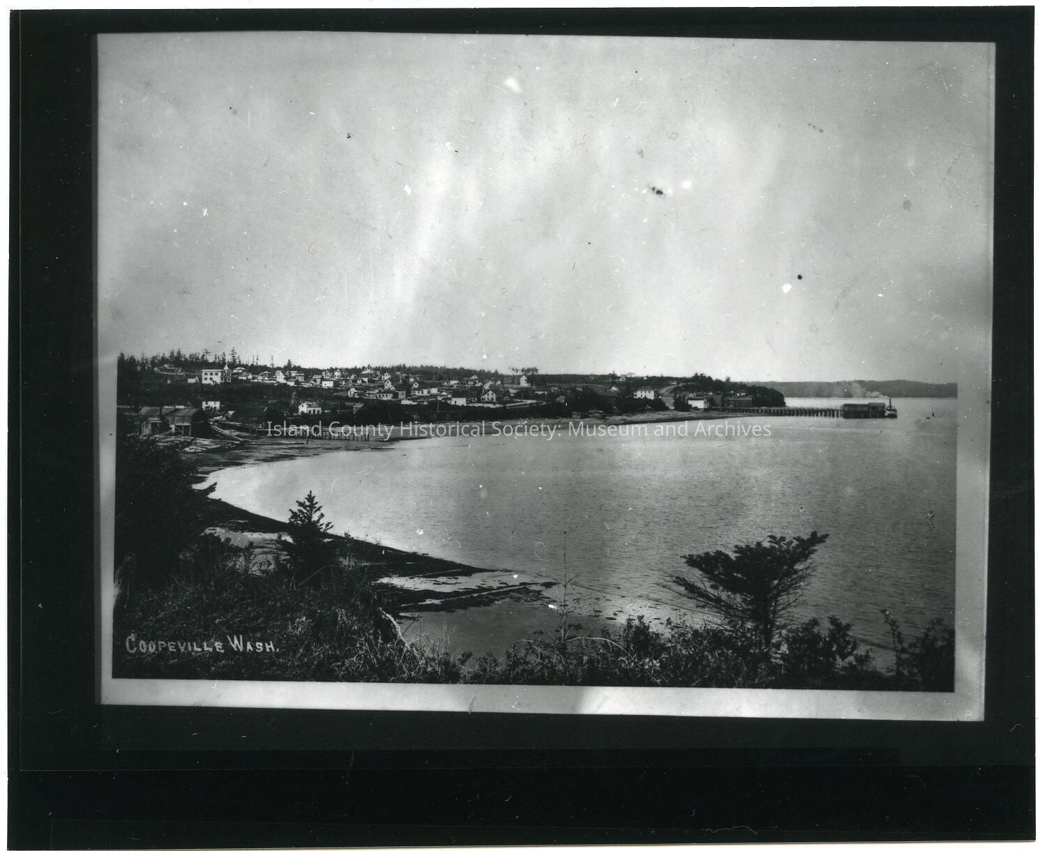 Photo of the negative of a view of Coupeville looking west with the courthouse in the left of the photo. Methodist Church in the far background. Wharf. Lovejoy's mill and wharf/pier on the left. Caption: Coupveille, Wash. On the negative sleeve: Coupeville Waterfront - with Lovejoy Mill 1910