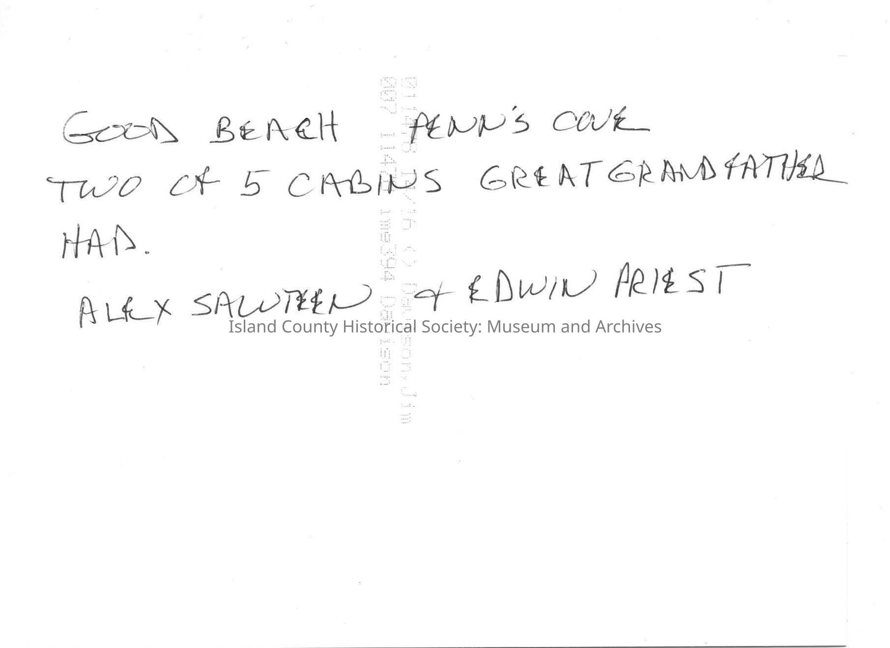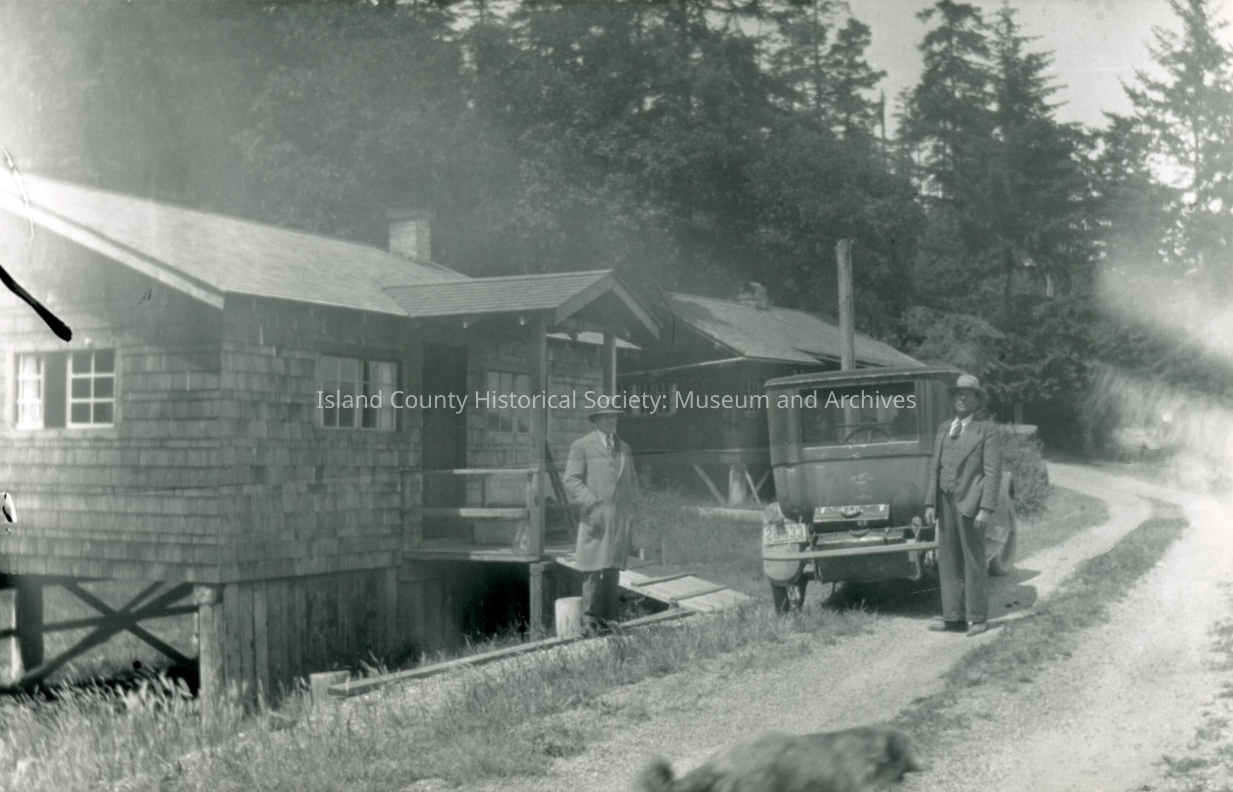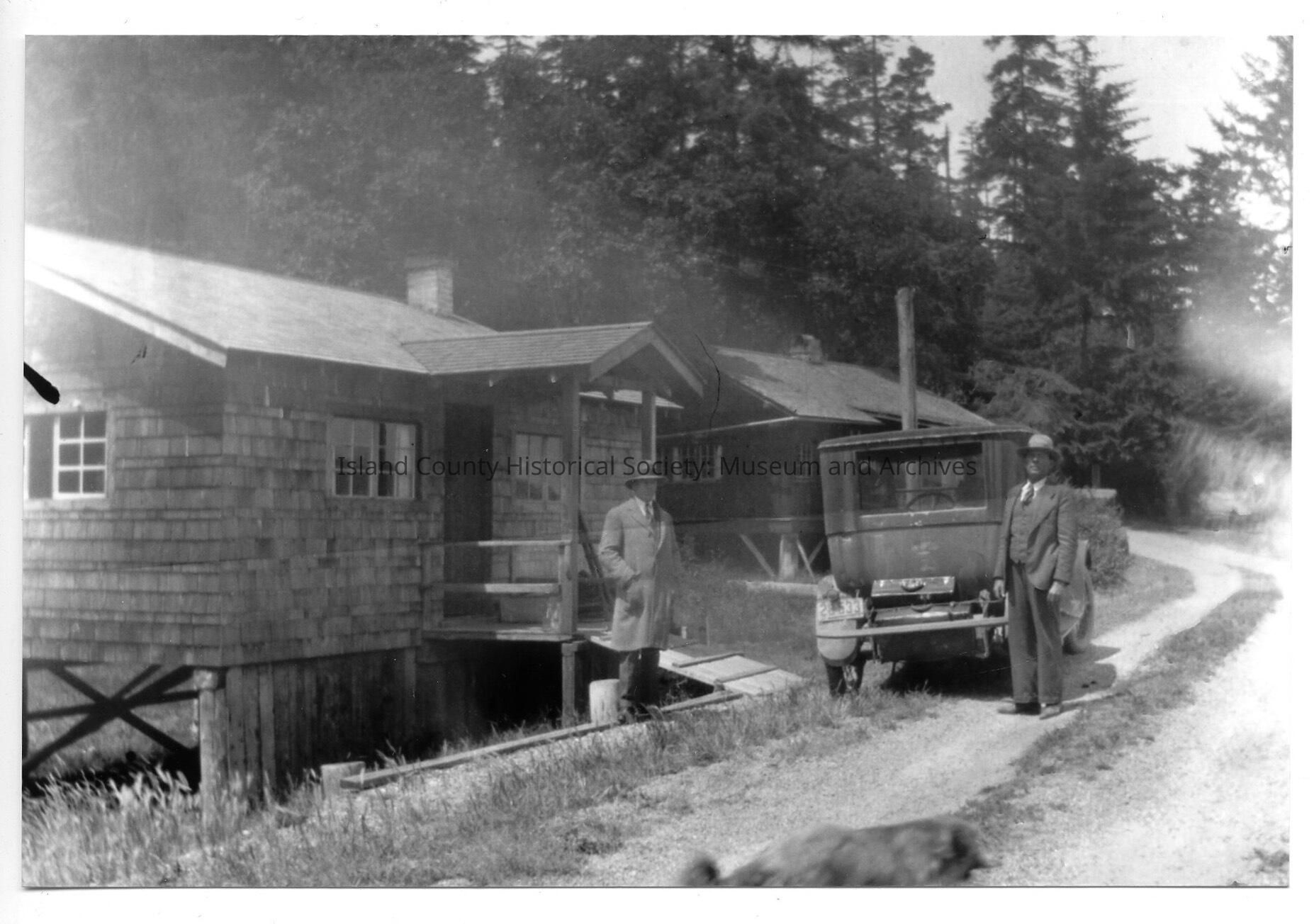 Photo of Edwin Priest and Alex Saluteen standing in front of cabins at Good beach. Written on back of the photo is Good Beach Penn Cove. 2 of 5 cabins great grandfather (Edwin Priest) had. Black and white photo. The car in this photo dates picture to the 1930s.