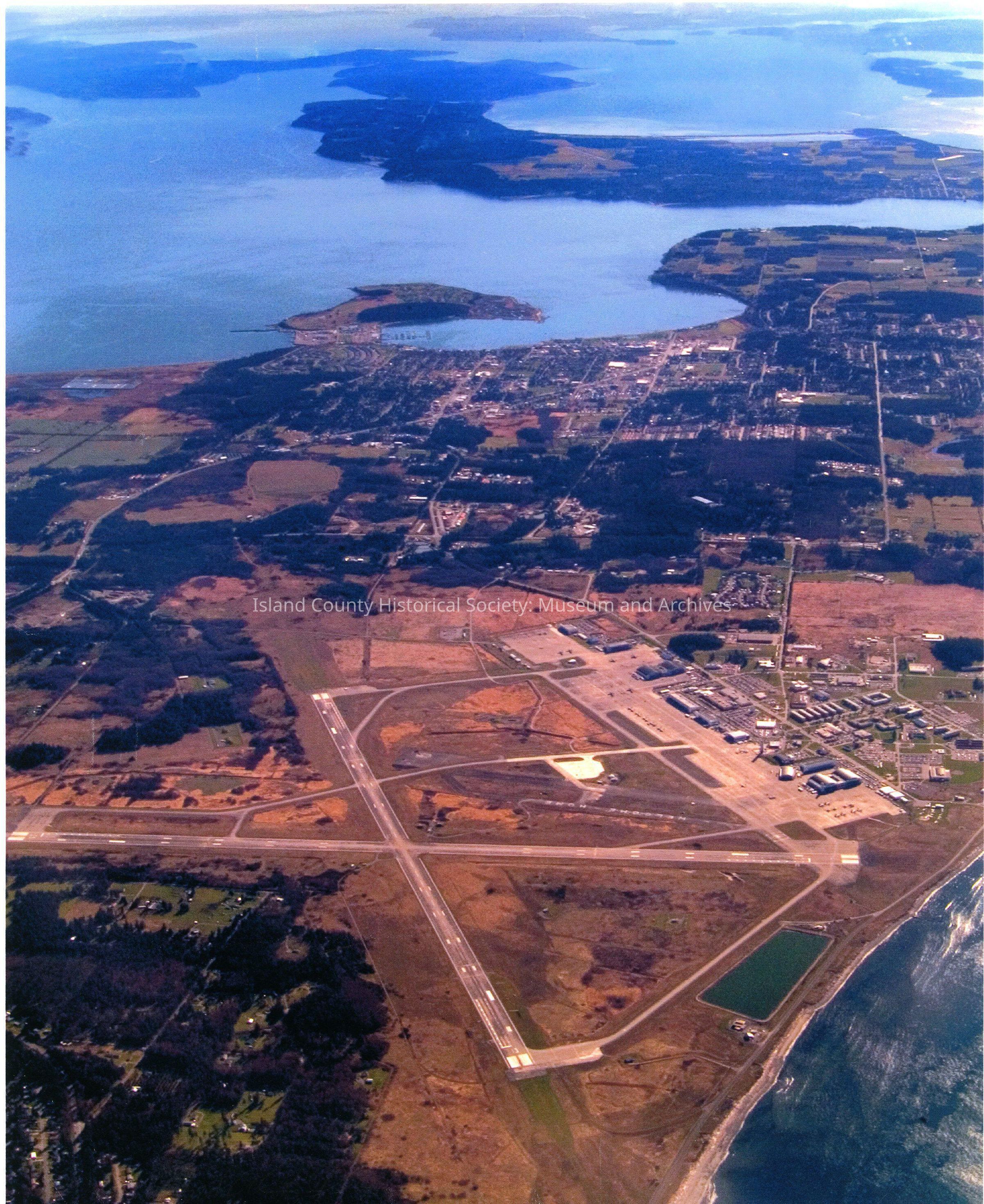 Color aerial photo of NAS Whidbey in Oak Harbor. Year unknown. Looking from West Beach across the Ault Field. The rest of Oak Harbor is visible as well as the Seaplane Base at Maylor's Point and then Penn Cove and Coupeville in the background (to the right of the photo). The runways, buildings and roads (including two entrances onto the base) are clear.