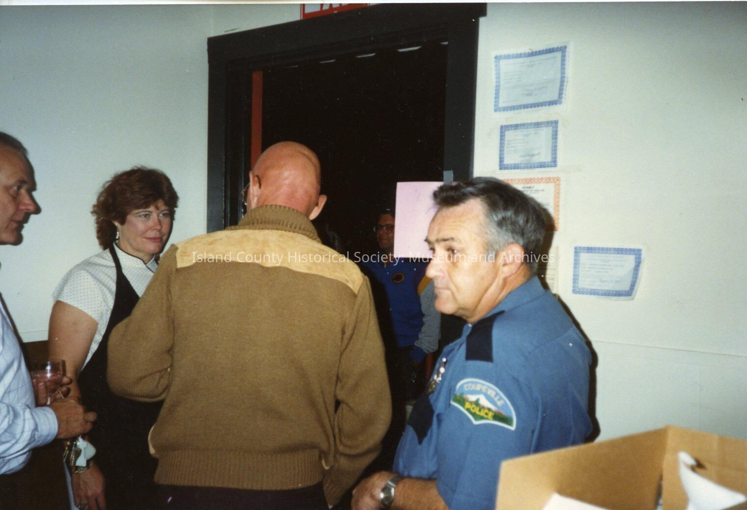 Photo of four people in a room. Police Officer is one. Door is in front of them. Handwritten on the back are these names - Mischel Ryan, Curley and Norm.