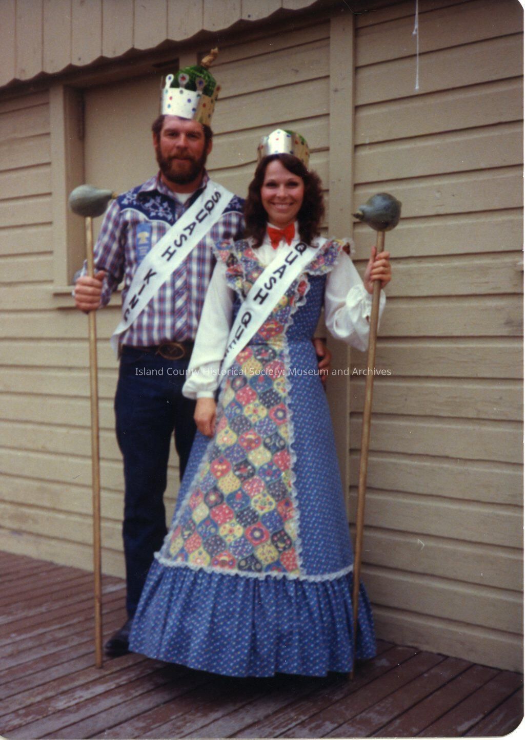 Photo of festival. On the back of the photo it states Squash King Dale and Queen Karen Sherman. Two adults standing outside a building. The male is wearing a sash that sais "Squash King", the women standing in the middle is wearing a sash that sais "Squash Queen".