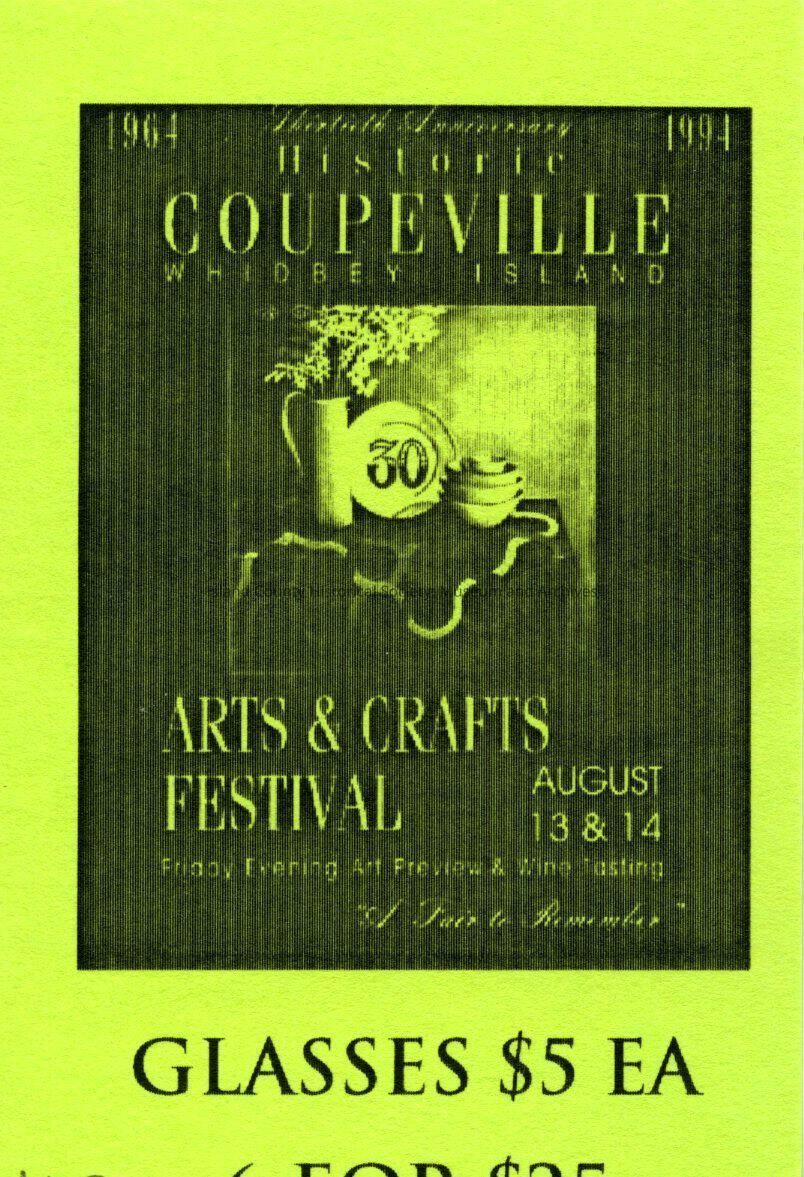 Green Ticket number 119 for 1994 Historic Coupeville Arts and Crafts Festival. Indicating 'Glasses $5 Ea, 6 For $25.