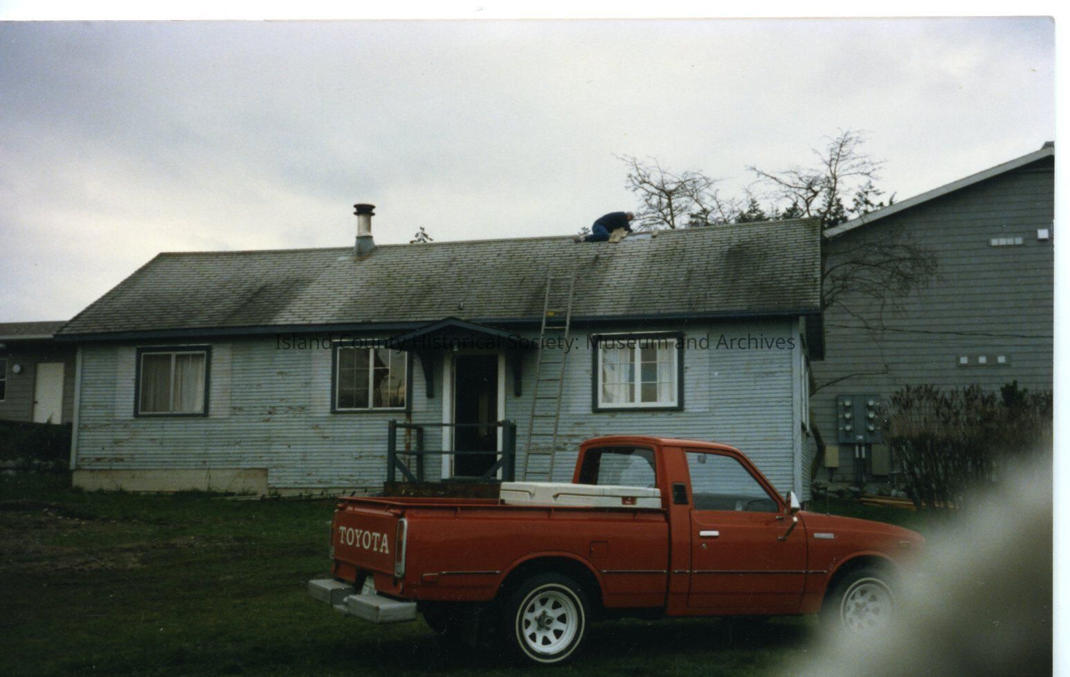 Building beind where the new Museum was built. Red truck. On back it says "Val on roof. 2/89..