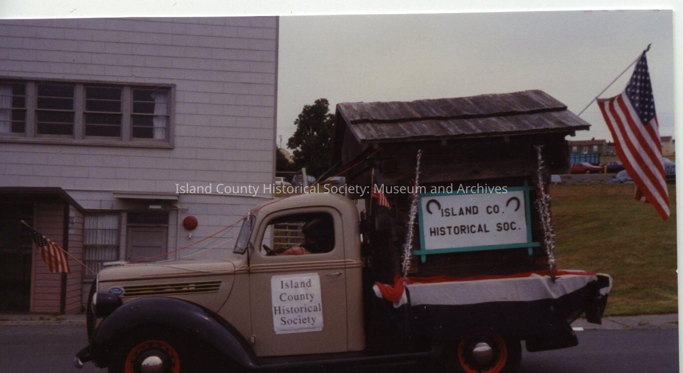 Old truck in front of building with words "Island County Historical Society. On back says OH 4th of July Parade. 7/88.