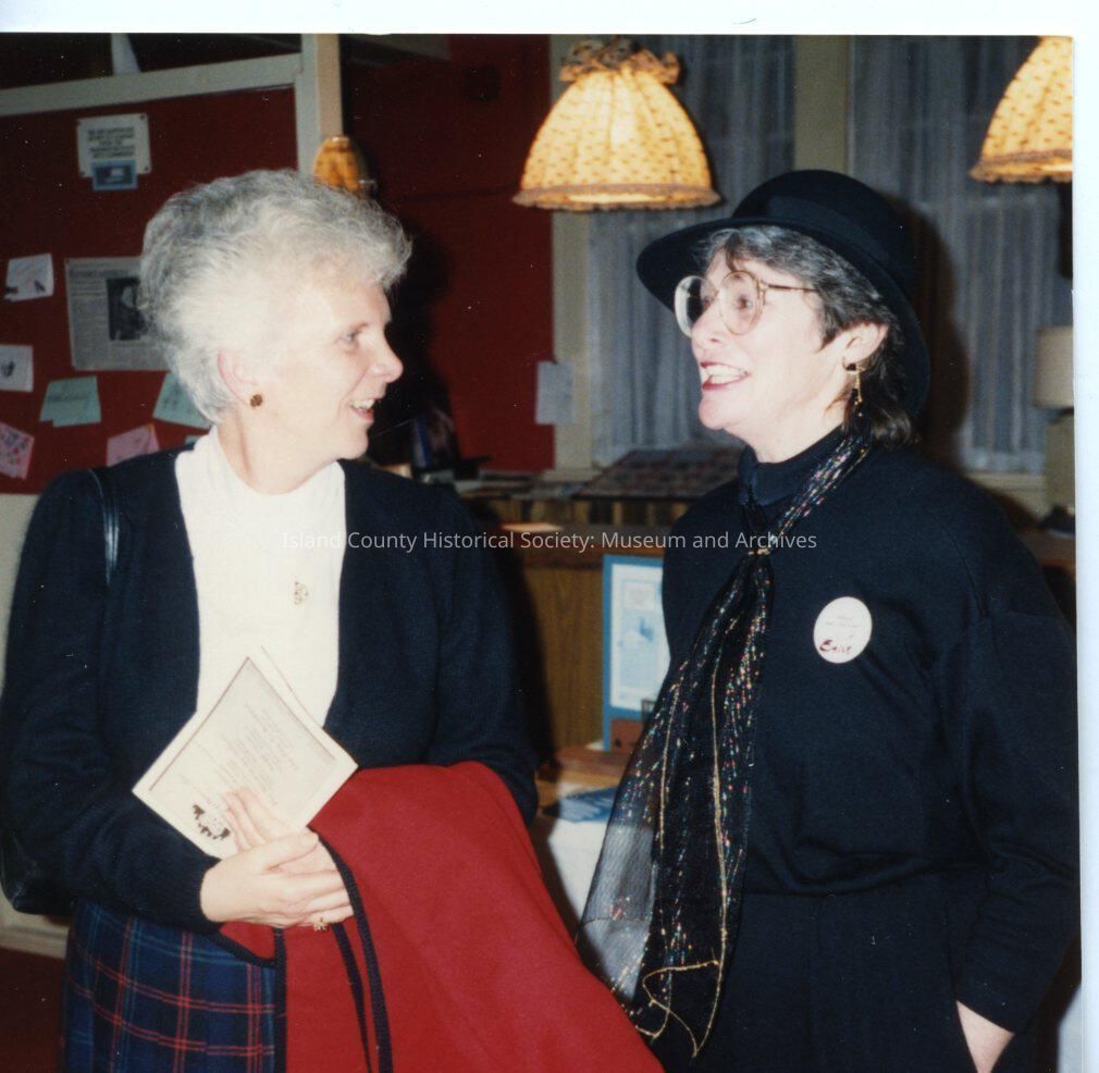 Two women inside building at a table with food platters and tall candles. Handwritten on back Emily and Muriel Pickard - Museum Tea. 10/88.