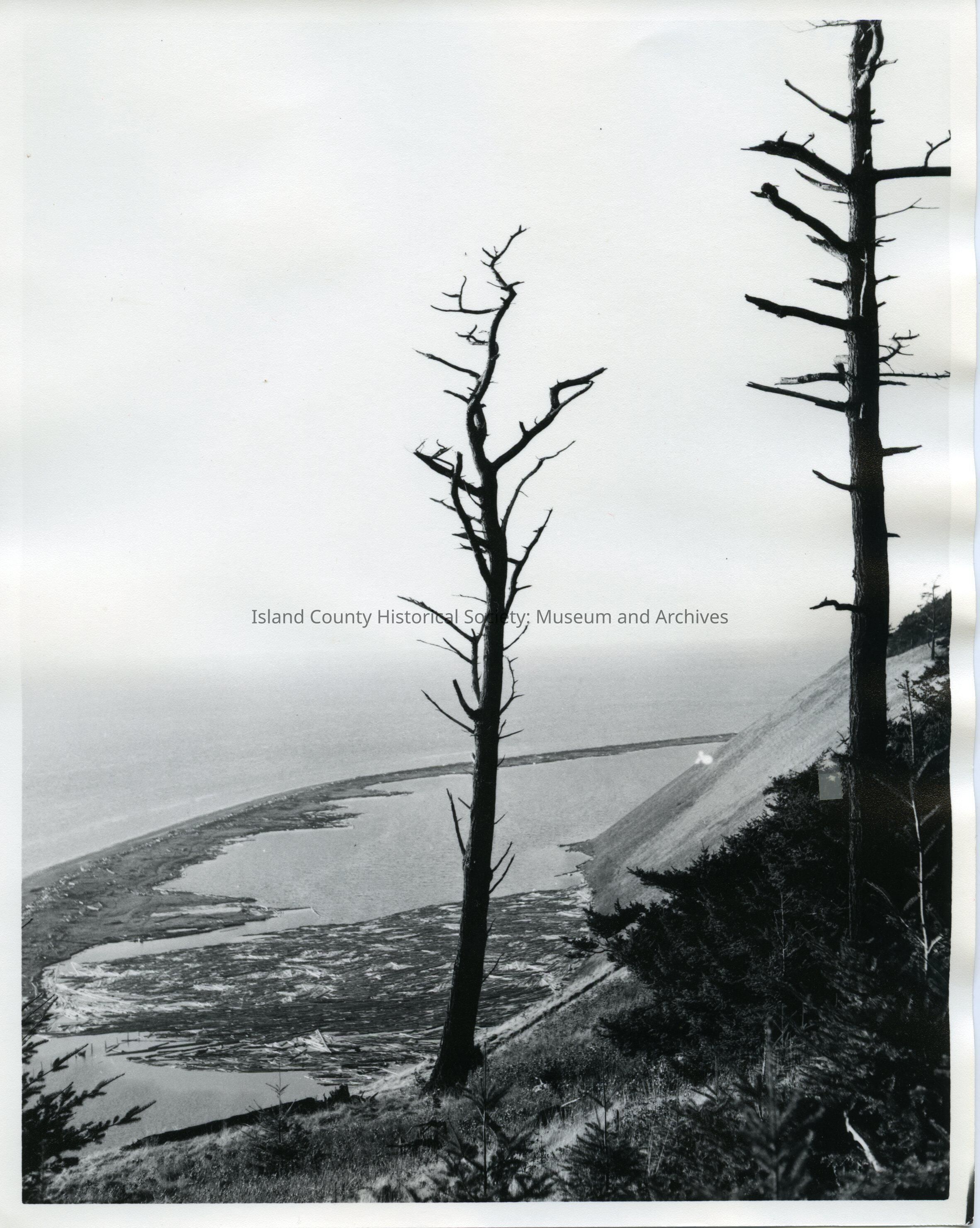 Black and white photo of beach with Perego Bluff and Perego Lake below. On the back of the photo it states Perego's Lake from the Bluff 1971.