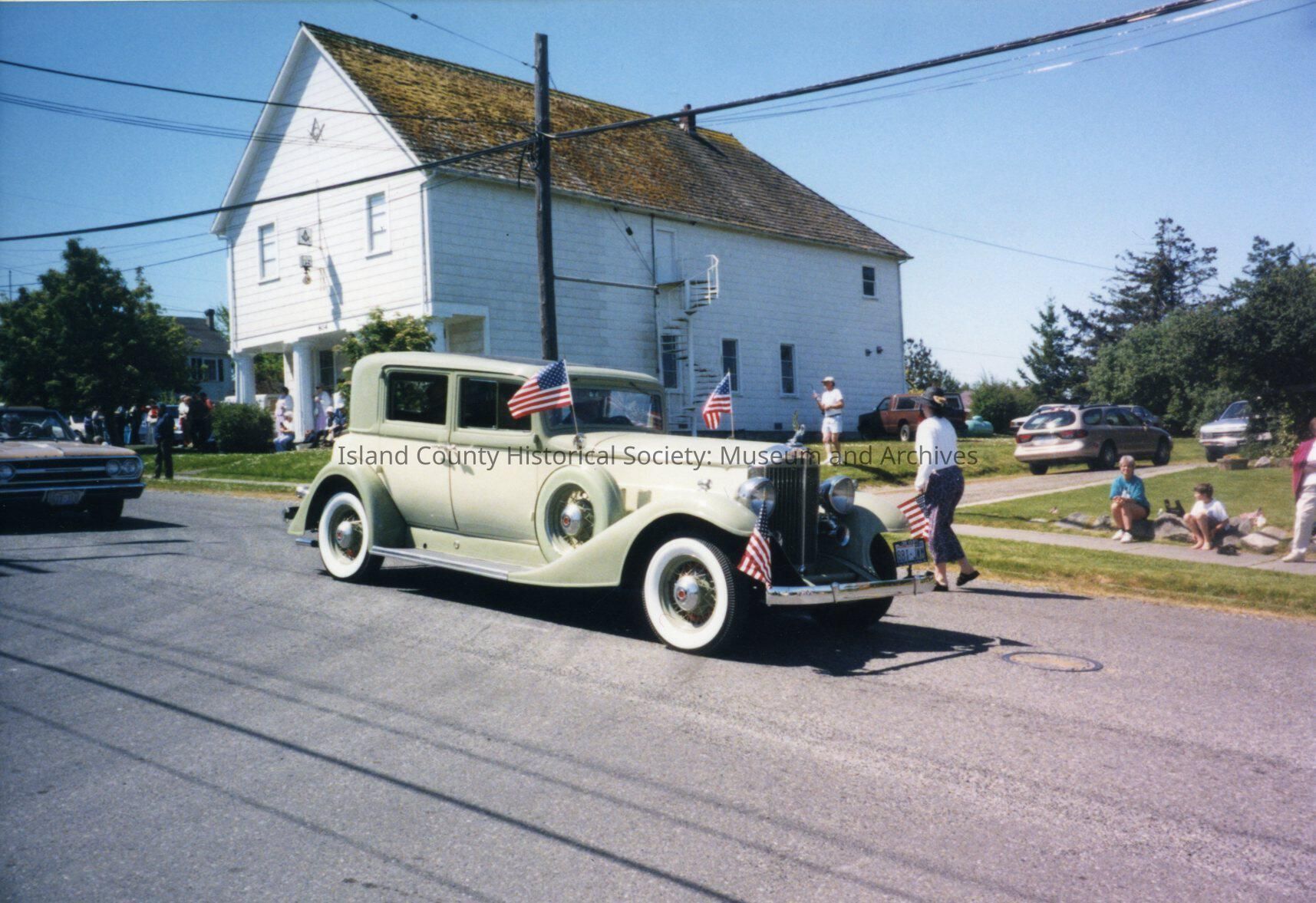 Photo of Old Masonic Hall on Main Street in Coupeville. Parade going down the street with people watching from the sides. Old white car with flags.