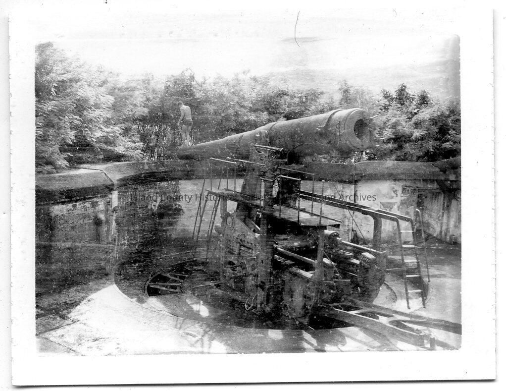 Polaroid black and white photograph of Fort Casey gun. Written on back: "Side VIEW one of 2 8" mortars main battery, Fort WINDT GRANDE Island PI 3 oct, 1961 (man walking down barrel, not diving off)"