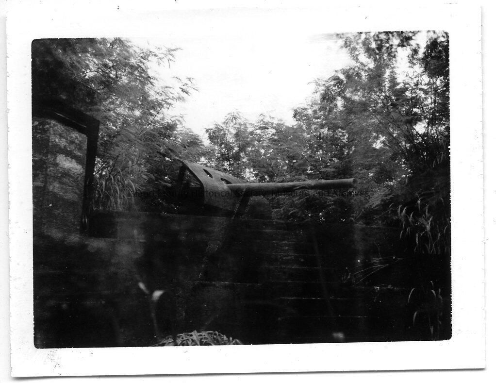 Polaroid black and white photograph of Fort Casey gun. Written on back: "4" Cannon Secondary battery #3 GRANDE Island P.I. 3 oct 1961"