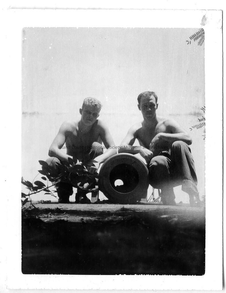 Polaroid black and white photograph of Fort Casey gun and two men. Written on back: "ROGER Olmstead Left JAMES Sutherland Right frame muzzle of large mortar, main battery at Grande Island. P.I. 3 oct, 1961"