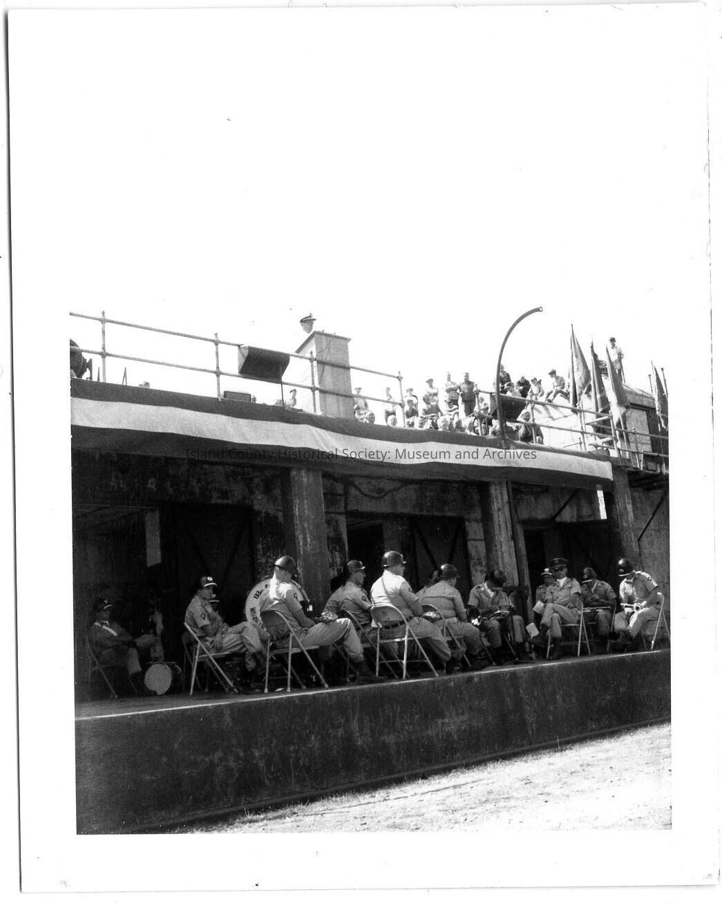 Black and white photograph of Fort Casey crowd, band, podium and speech.