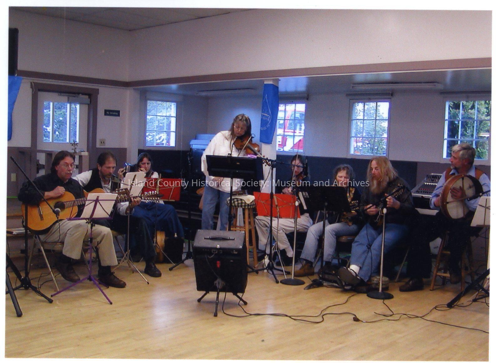 Coupeville Water Festival, 2002. A group of musicians, men and women, in the Coupeville Rec Center playing songs. Guitars, drums and violin.Collection