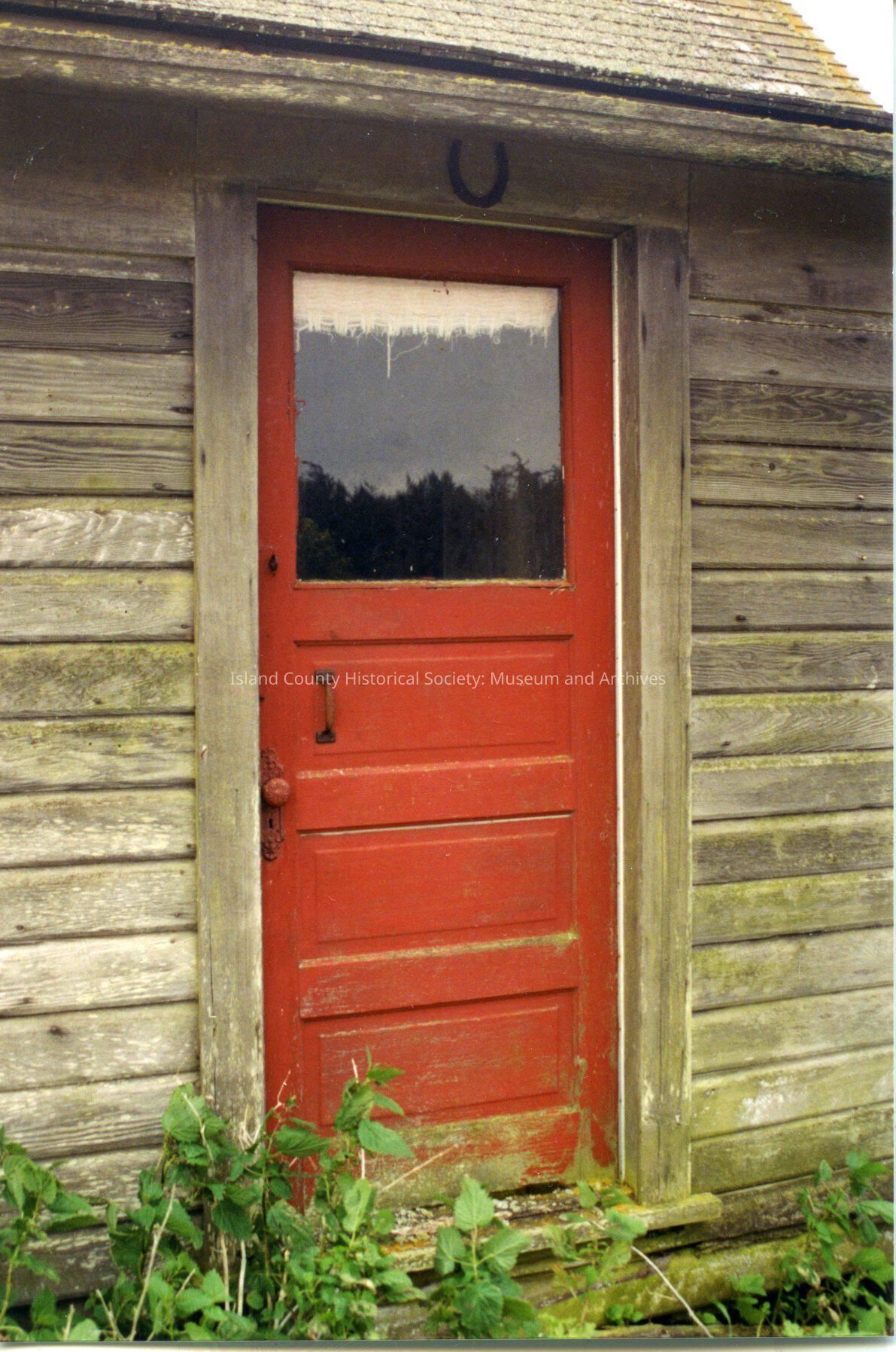 Outside view of Jacob Ebey House. Saltbox Residence. Wood frame set on wood post/concrete block foundation: rectangle (20'x32'). Image shows a red door with a horse shoe placed above the entrance. The door has a window in the upper half,