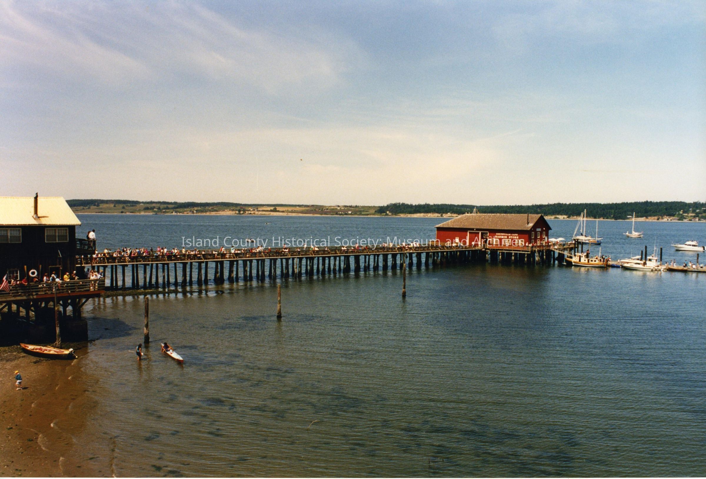 Coupeville Water Festival, year unknown. Color photo. View from Front Street toward the wharf and the western end of Penn Cove. The pier and wharf have many spectators on it and there are several boats tied up to the dock.Collection