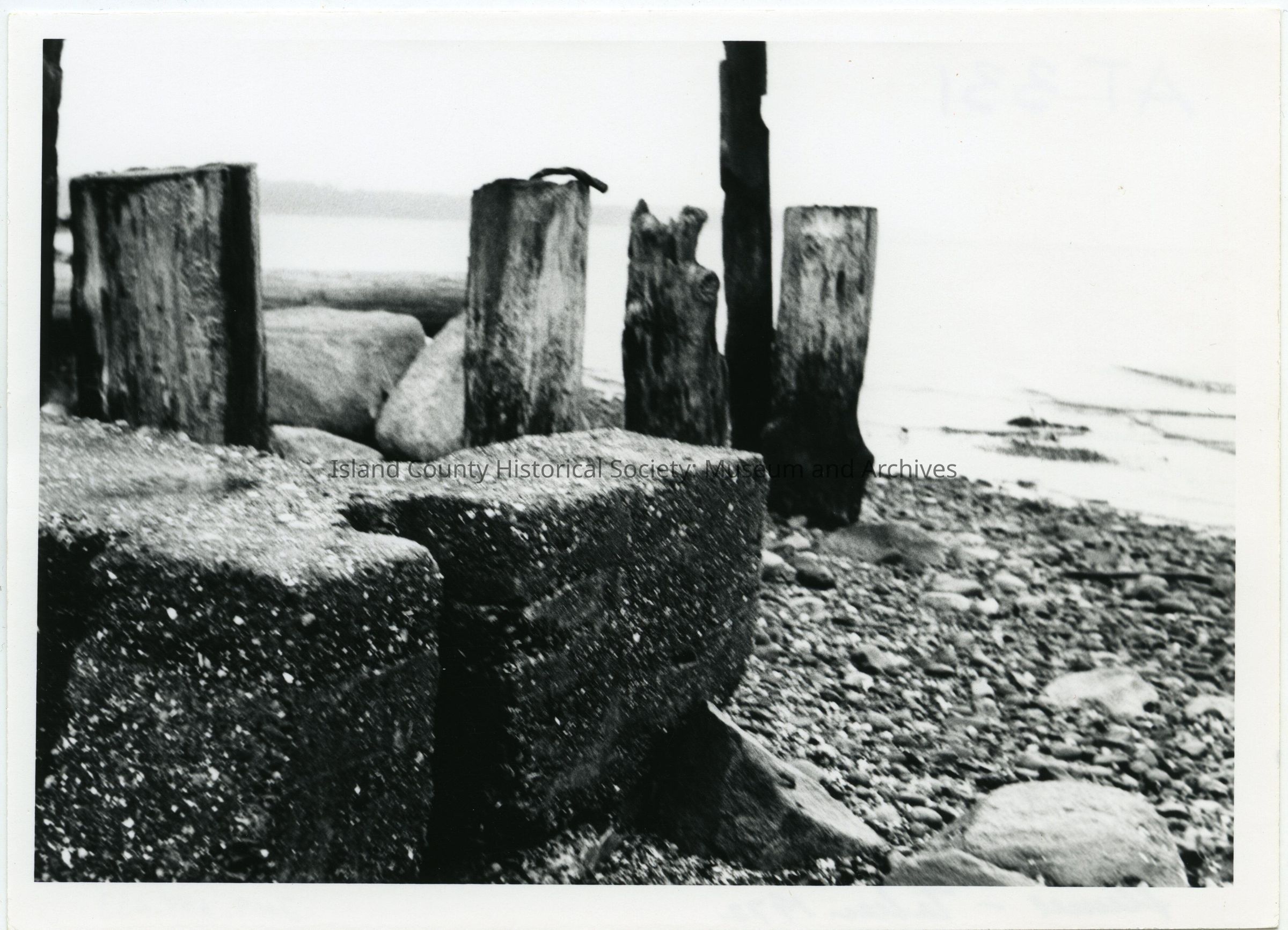 Photograph of the remains of a grist mill that used to be in Kennedy's Lagoon. On the back: "Flume taken 1972" from old grist mill. The grist mill was built in 1867 From folder: San de Fuca, Coveland, grist mill