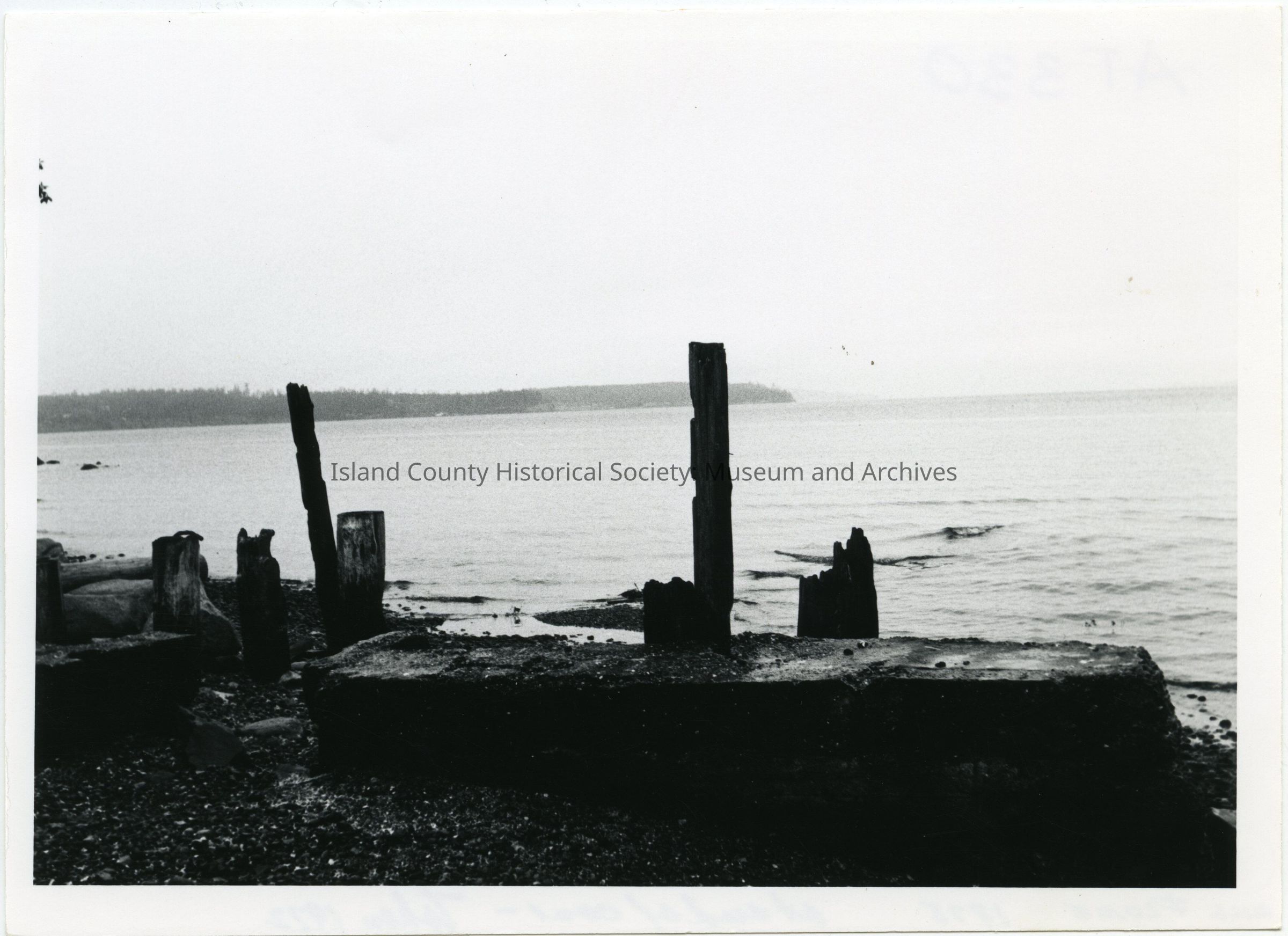 Photo of the remains of the grist mill that used to be at Kennedy's Lagoon. On the back: "Mill flume 1878, at end of cove, taken 1972"