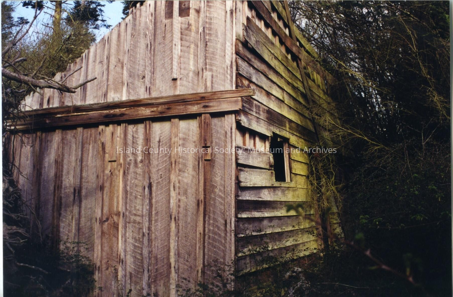 Chinese Tenant Farmer House. Outside view. Ruins. Wood frame set on wood block foundation; board and batten siding with shiplap siding over board and batten on south facade; center entrance on south facade; one window opening left of entrance; evidence of loft on west wall; wall insulated with rags and newspaper; 3 walls extant.