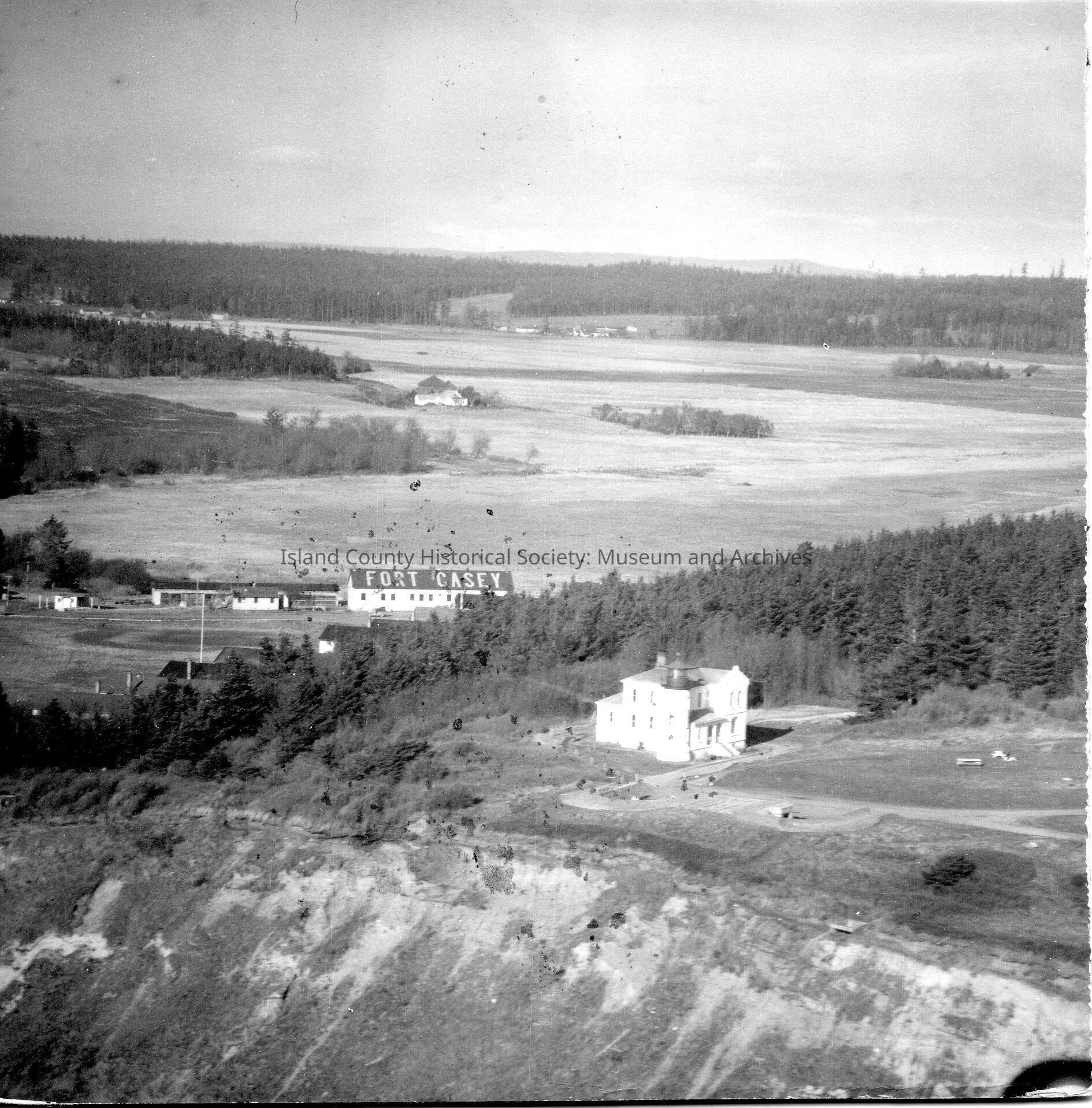 Aerial photograph of Fort Casey lighthouse and buildings. The photo is on cardboard.