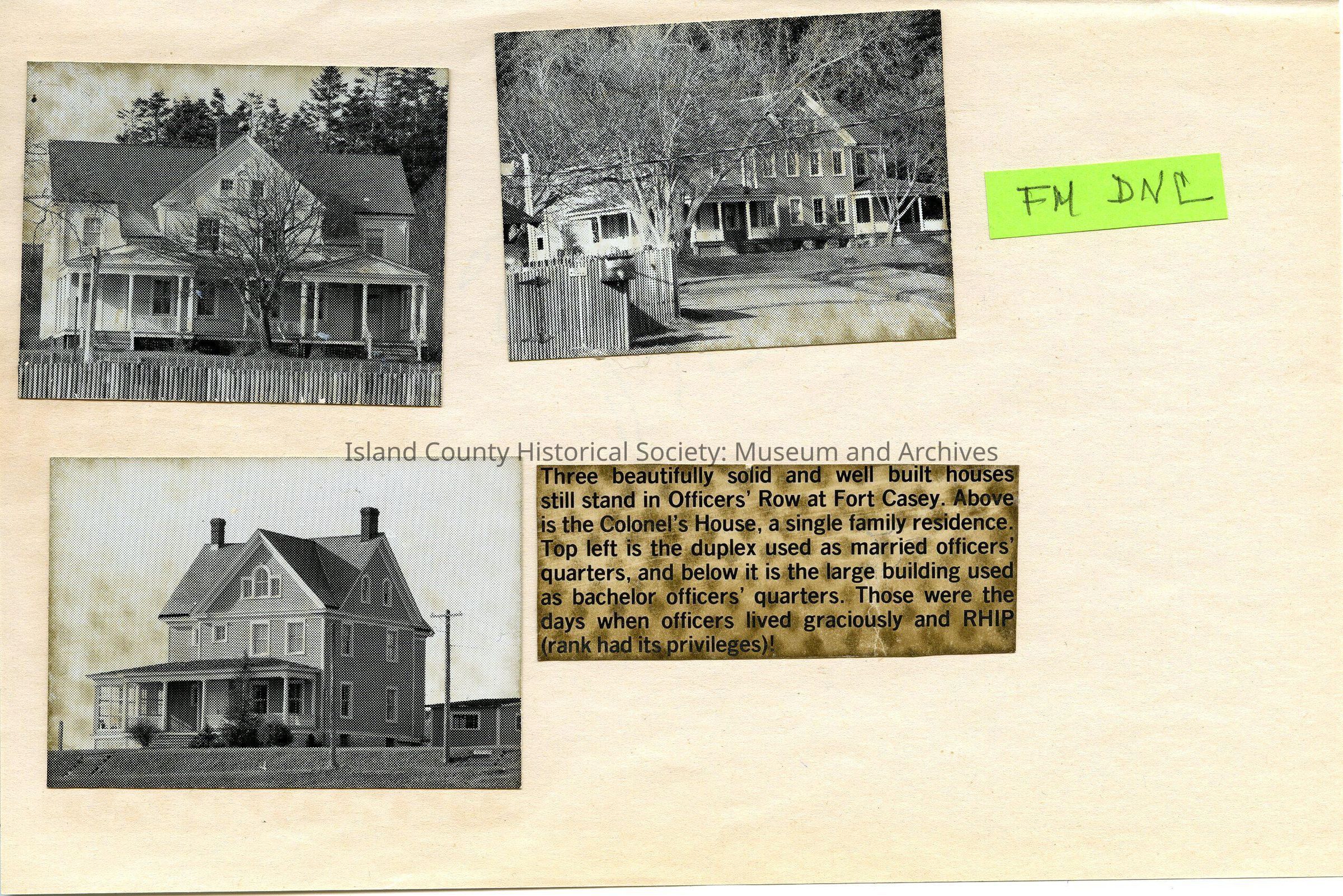 Three black and white photographs of Officers' Row buildings. Included is the Colonel's House, a family home, and a duplex.Collection