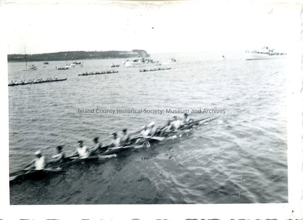 Native American Coupeville Water Festival. At least 4 canoes with 11 men paddling toward the photographer. There are other boats, one probably a small steamship, beyond the racing canoe.Collection