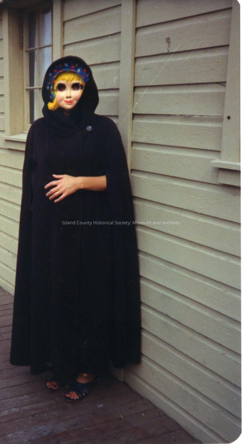 Photo of woman with mask on and a black hooded cape, standing outside a building. Handwritten on back of photo is number '83 and name Madame X.