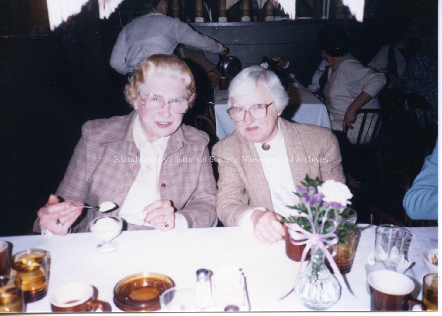 Photo of a two women at a table in a restaurant with food on table at Keystone Cafe. Flowers in vase on table. Handwritten names on the back of the photo are Chris Christsen and Mickey Becker.