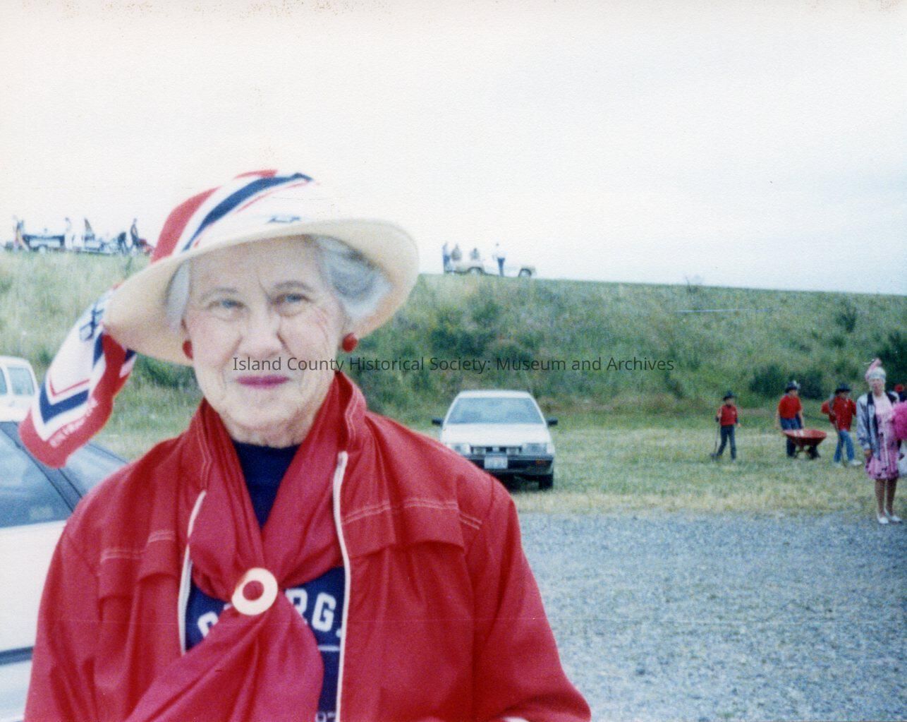 League of Women Voters of Whidbey Island. Alice Boston is dressed in red, white, and blue with red earrings and a straw hat with red, white and blue scarf. She is outdoors with cars and people in background, perhaps at a parade.Lexicon