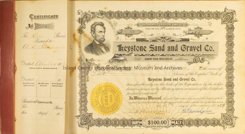 Digital copy of "Keystone Sand & Gravel" shared book. Contains certificate number 1 which was purchased by A.D. Stevenson April 29, 1912. Sepia toned photograph.