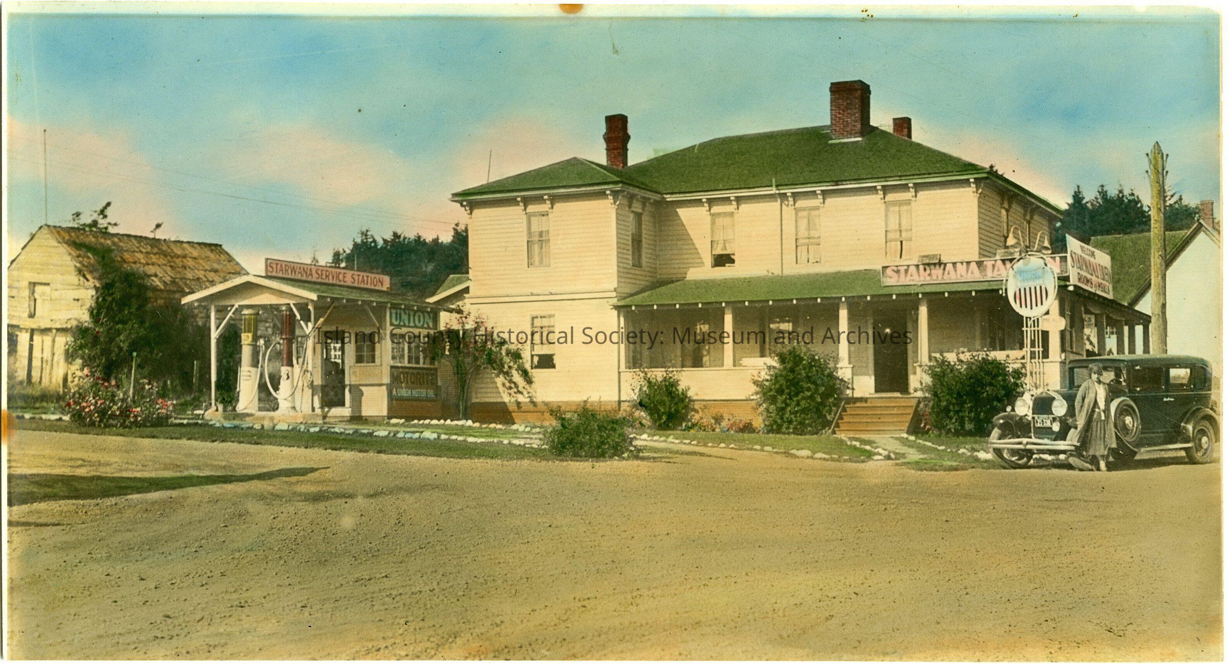 Photo (colorized) of the Starwana Inn, Service Station, and the Alexander Blockhouse. The service station has two gas pumps (Union, Motorite). A woman is standing in front of an old car on the right. Inn has at least three chimneys, wrap-around porch. Stones line the paths.
