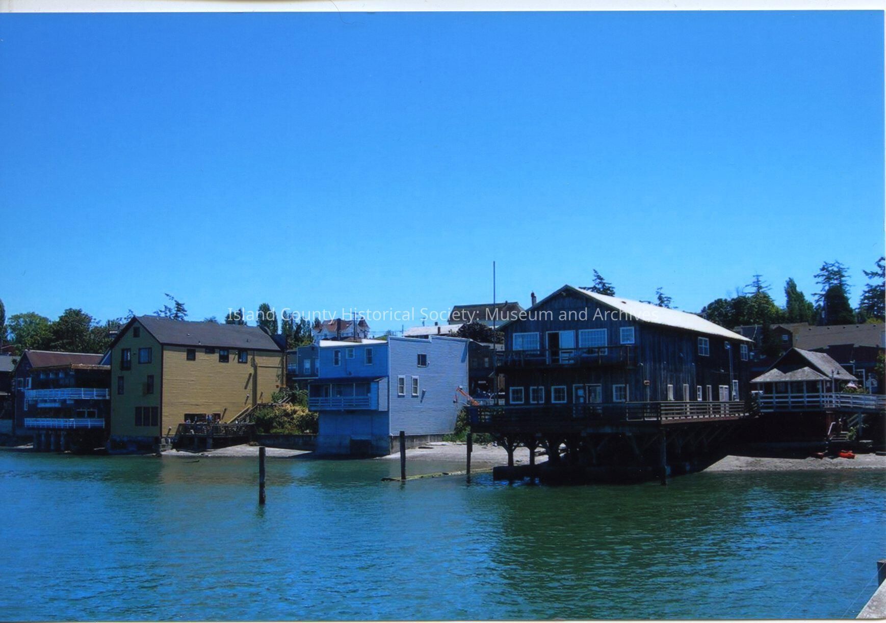 Photo from Penn Cove water of backside of Front St. buildings to include the livery, Tee and Me, Toby's Cafe, Far From Normal, Whidbey Isle Yarns, Gifts and Teas. On back of photo is hand written the date of July 2008.Made/Created