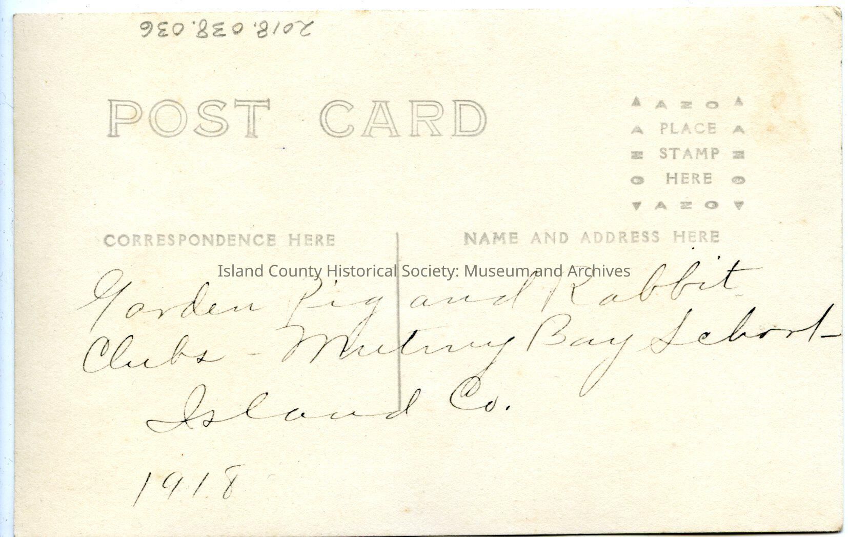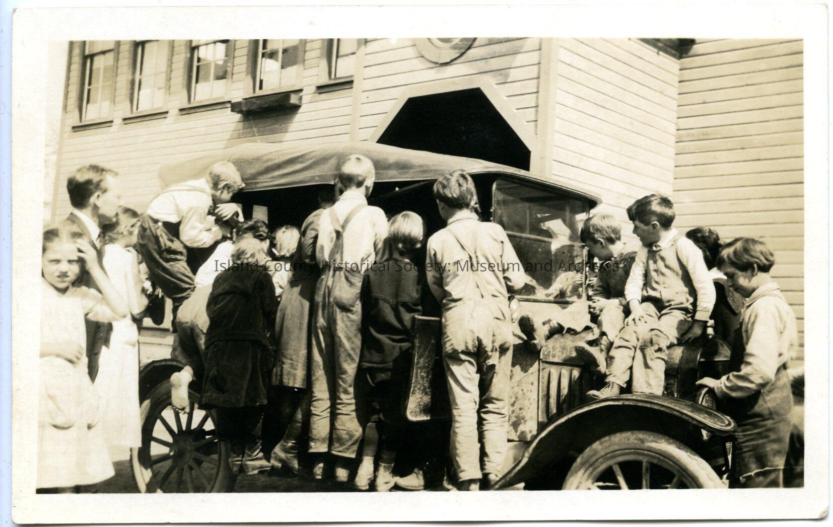 Photo of children standing on running boards and fenders of a vehicle and looking inside of it. Back reads: Garden Pig and Rabbit Clubs - Mutiny Bay School - Island Co. 1918