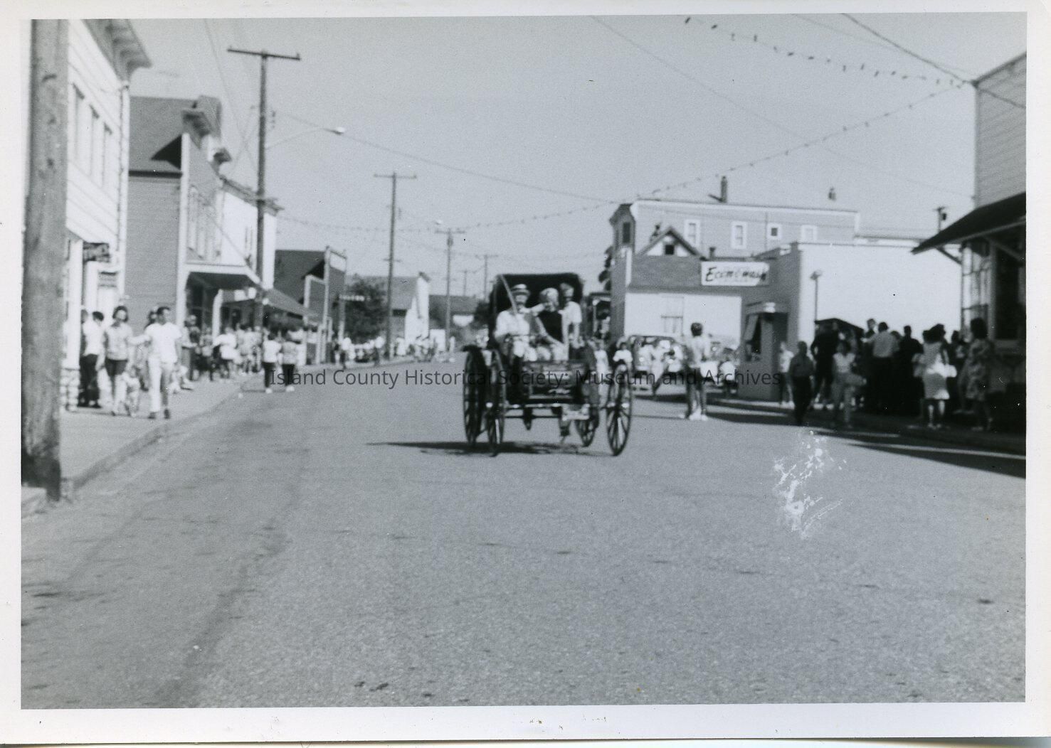 A photo of the Holsman car on Front Street, Coupeville. A woman and two men (one the driver) are in the car. People are walking along the sidewalks on either side. Written on the back: Carl Dean's 1902 "Holsman" auto buggy.