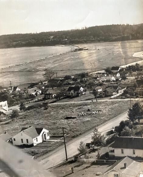 An aerial photograph in black and white of Oak Harbor in the 1940s. Houses in the foreground and the shore in the background