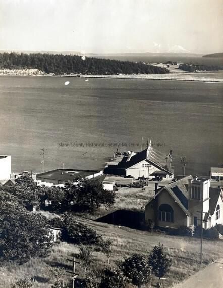 An aerial photograph in black and white of Oak Harbor in the 1940s. A building and a church can be seen near the shore