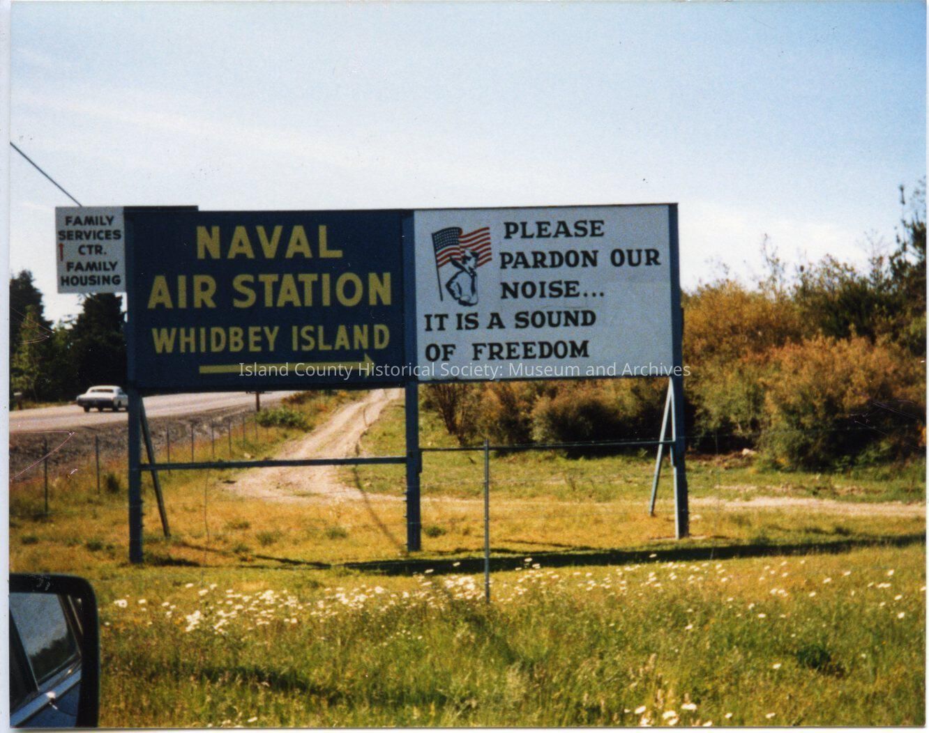 Color photo of a sign pointing the way NAS Whidbey Island. Also another sign next to it that says "Please Pardon Our Noise....It Is A Sound Of Freedom. These signs are by the road.