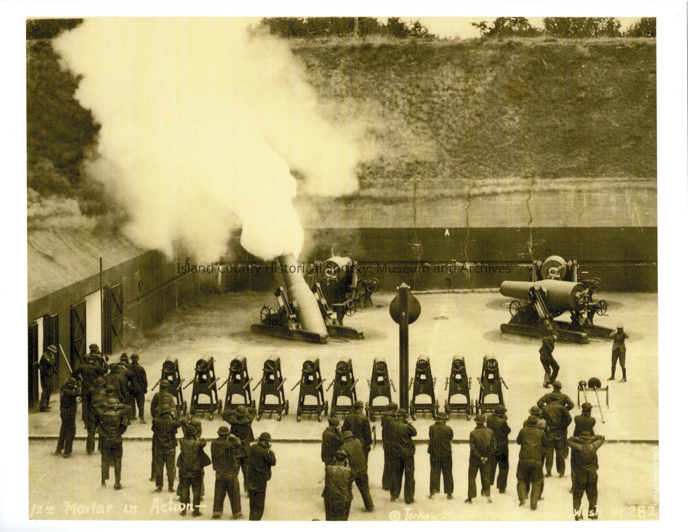 Black and white (sepia) postcard image of a test firing of one of Fort Casey's mortars. Caption: 12 in Mortar in Action - Wash. No. 282