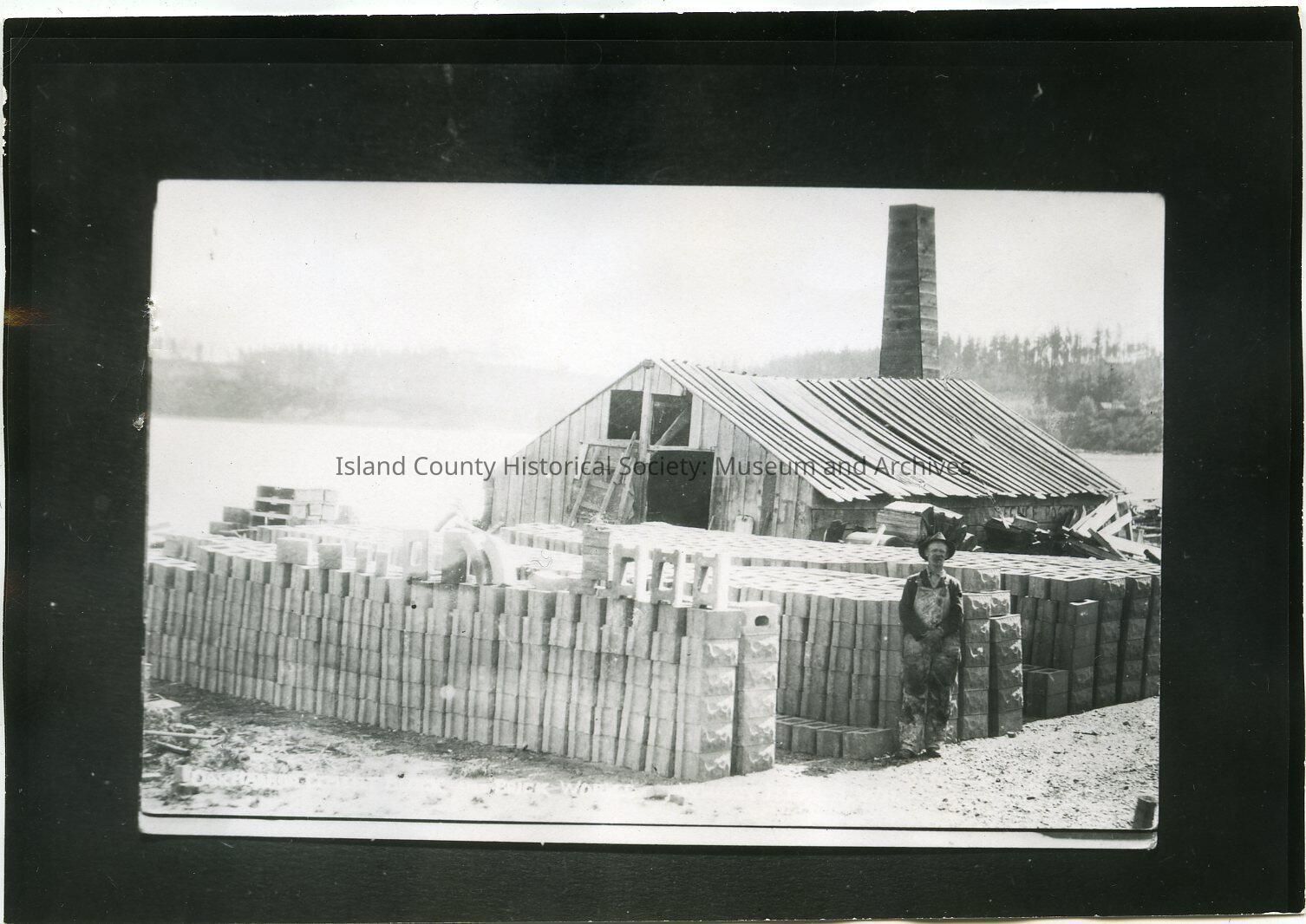 Photo of a shack or small building with long roof slats - some of which are missing. Large chimney. Ladder to windows at roof peak. Rows of stacked concrete blocks. Man in overalls and hat standing beside them. At the waterfront, hill in the background. Caption: Oak Harbor Cement Block and Brick Works, Whidby Island, WN. (sic)