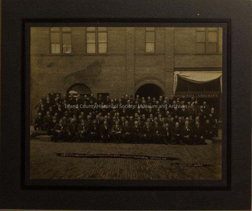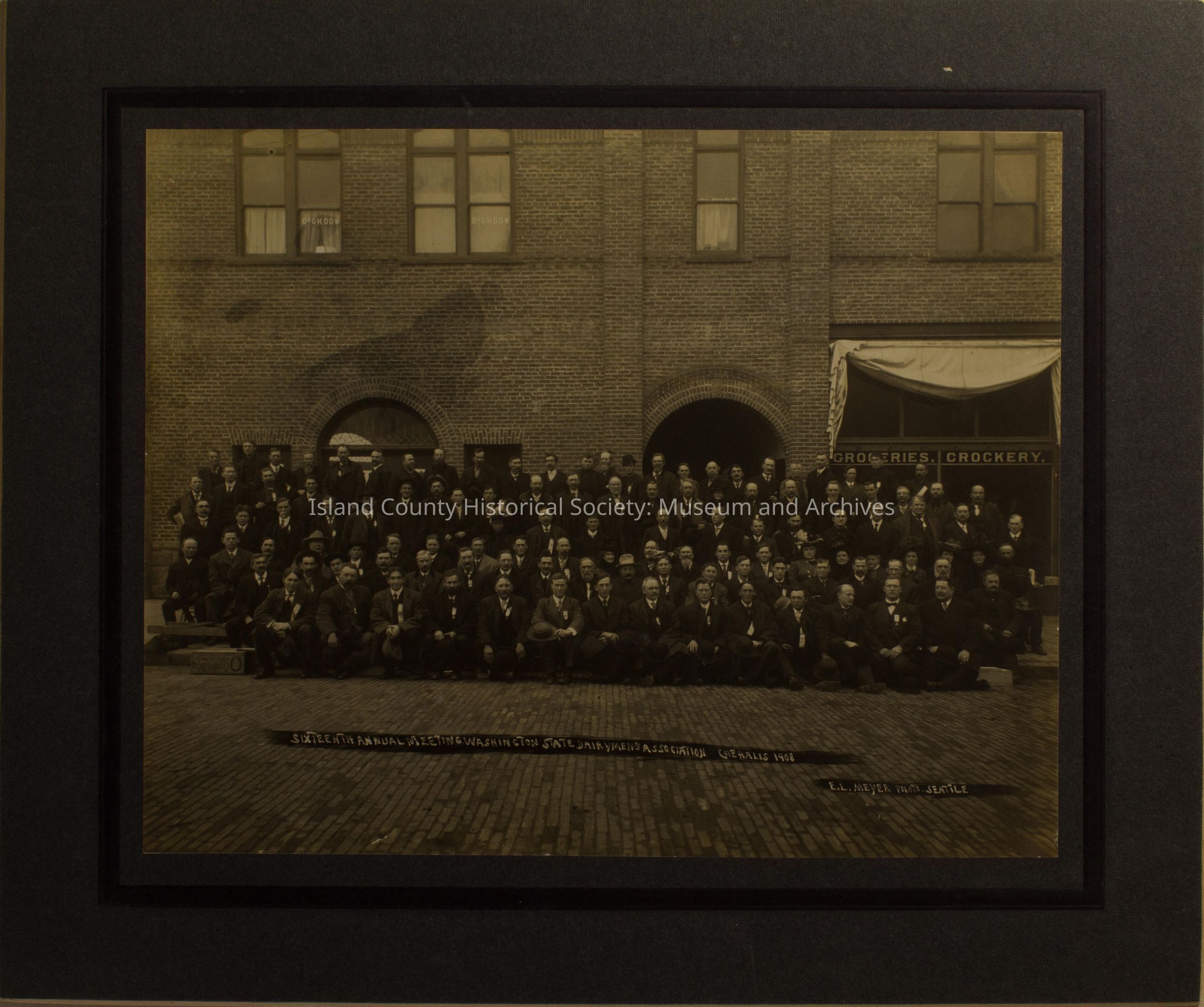 A photo of many men in front of a building. On the building is a window with this sign "Groceries. Crockery." A writing in front ot the men says "Sixteenth Annual Meeting Washington State Dairymen's Association, Chehalis 1908."