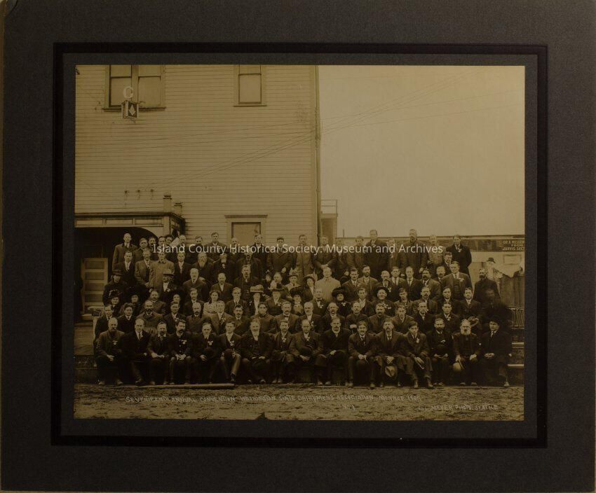 A photo of many men in front of a building. A writing in front ot the men says "Seventeenth Annual Convention Washington State Dairymen's Association, Monroe 1909."