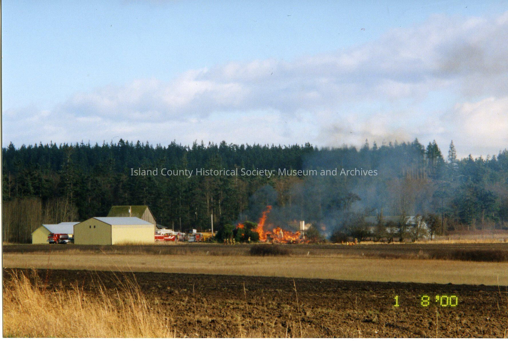 Photo of a structure being burned for training exercise on Crockett's Prairie. On photo it is written that the structure being burned, old home on Ebey's Prairie "house not of historic interest". "Home donated by the Boyers". Date stamp on photo is 8 '00.
