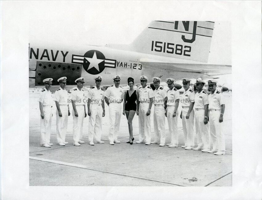 A photo of many Navy men standing in front of a Navy plane. In the middle of the men is a woman in a dark bathing suit.