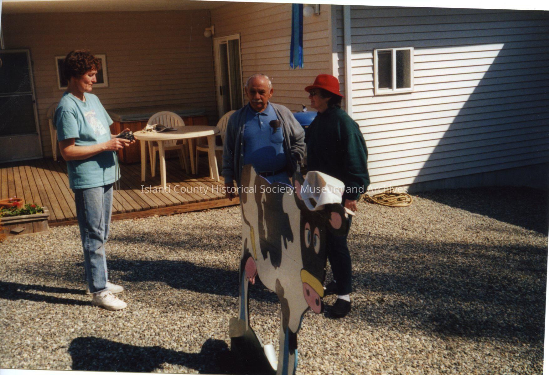 Photo of people outside of home. Handritten on the back is these names: Carol Peralta, Sal Rizzo and Emily Ramsey.