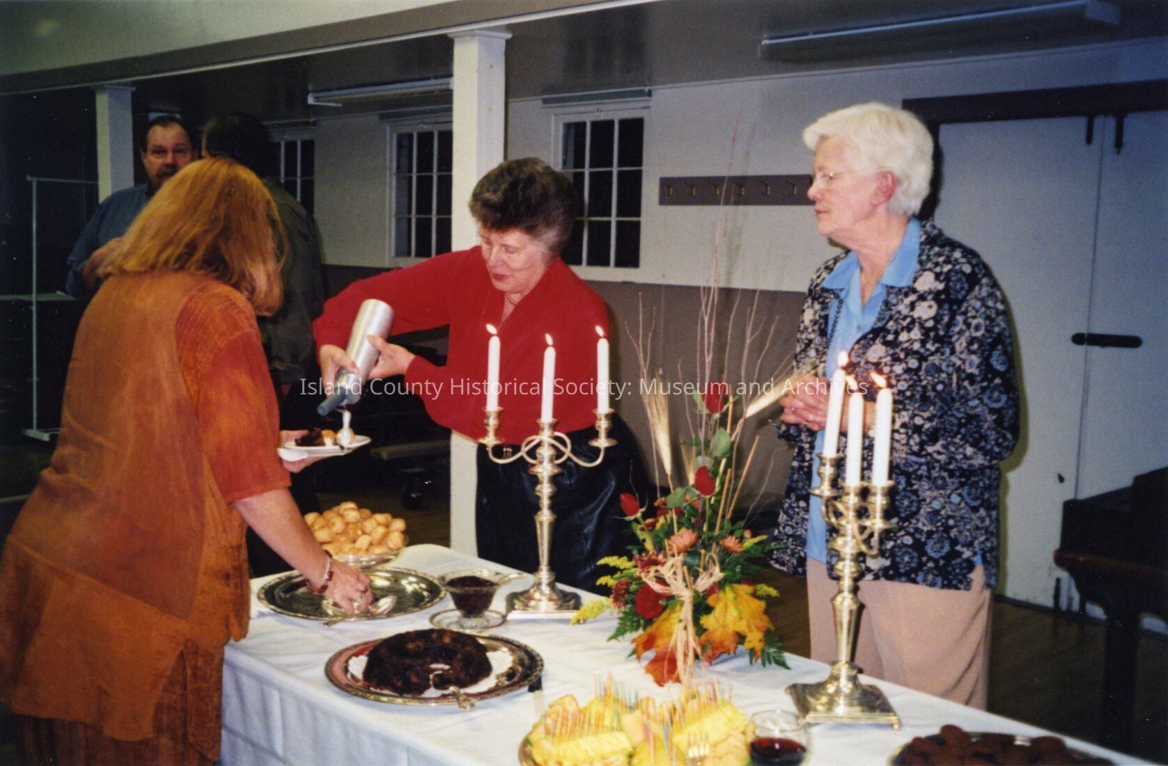 Photo of three people in the Coupeville Rec. Hall. Tables of food and candles. Handwritten on the back of the photo are these names: Jan Bronson and Beth.