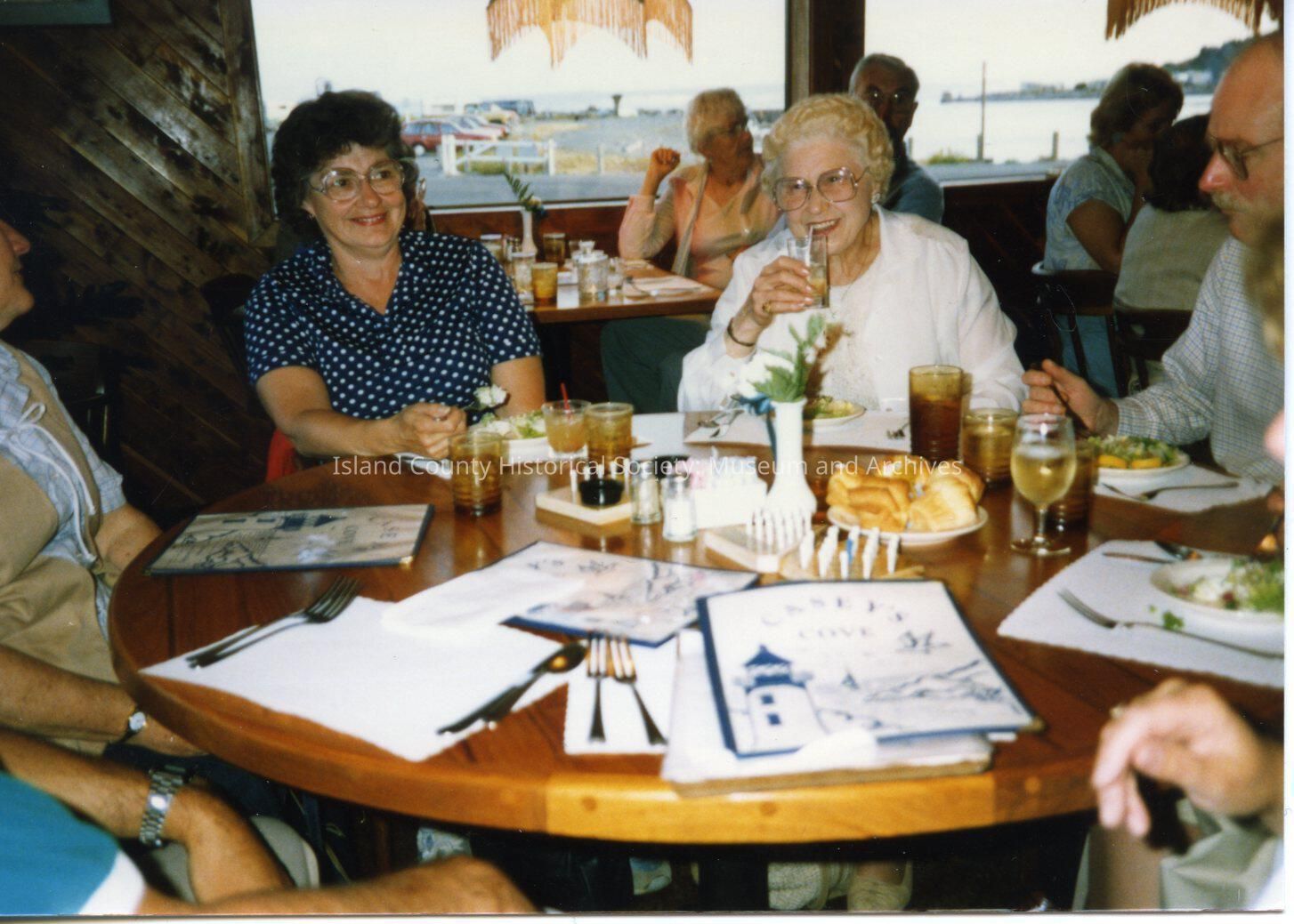 Photo of a several people at a table in the Keystone Cafe with food on table and the window behind looks on water. Handwritten names on the back of the photo are Sylvia Turkington and Chris Christsen.