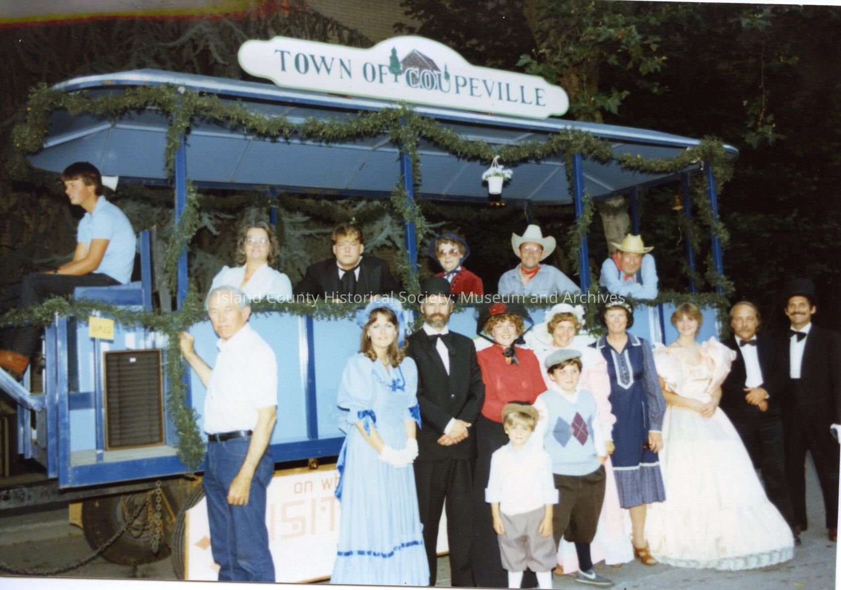 People standing by trolly in Seattle Torchlight parade. The top of the trolly says Town of Coupeville. Handwritten on the back of the photo is "Reuble Trolly in Seattle for parade - Torchlight....Pard Reuble, Bennye Weber, Mike Putman, John Shanafelt, Al Wahn (Blue Dress Val Arnold)Made/Created