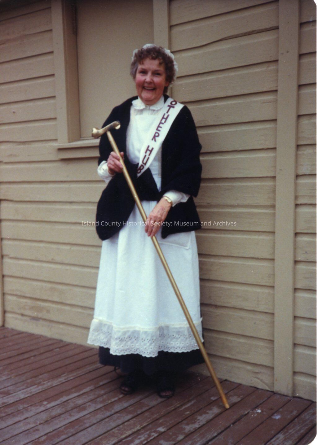Photo of festival. On the back of the photo handwritten "Bethel McBrayer Mother Hubbard". Dressed in costume standing outside a building posing for photo holding a staff. Women wearing a long dress with white cotton cap with a sash that sais Mother Hubbard.