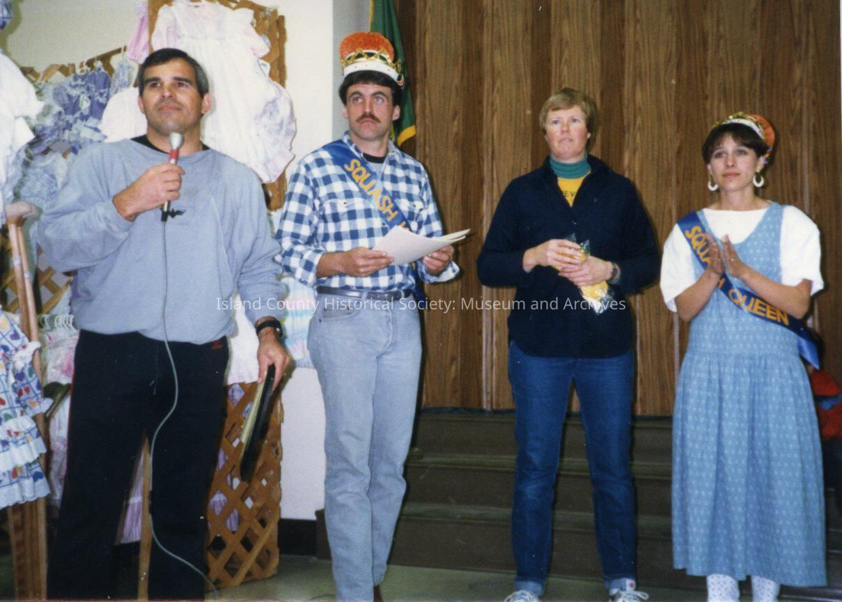 Photo of Harvest Festival. Four individuals on stage, On the back of the photo it states: Harvest Festival, Mac Whyte, Don Sherman, Val, Debbie Sherman. Date written on photo is: 11-88.Made/Created